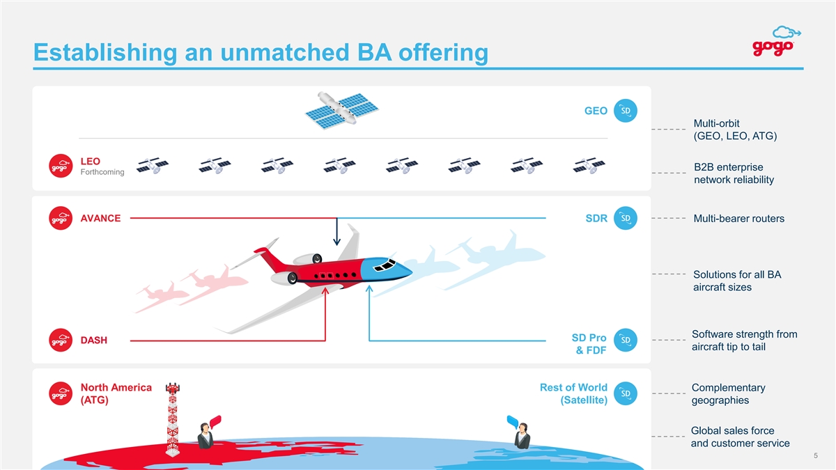 Establishing an unmatched BA offering GEO Multi-orbit (GEO, LEO, ATG) LEO B2B enterprise Forthcoming network reliability AVANCE SDR Multi-bearer routers Solutions for all BA aircraft sizes Software strength from SD Pro DASH aircraft tip to tail & FDF North America Rest of World Complementary (ATG) (Satellite) geographies Global sales force and customer service 5
