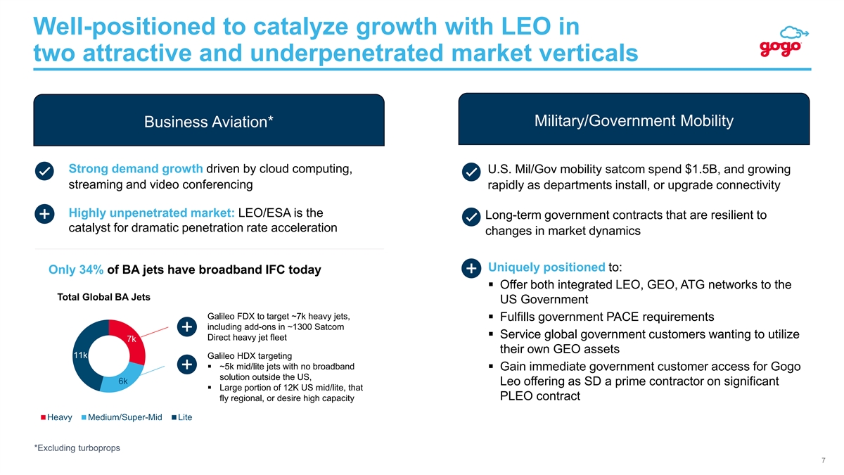 Advances Gogo’s strategy for long-term value creation 1§ Satcom Direct’s leading ex.-NAM service and support infrastructure provides an immediate launchpad for Gogo Galileo § Satcom Direct’s 1,300 SDR-enabled jets are prime candidates for adding Gogo Galileo Expand TAM to include § Unique opportunity in the military/government mobility vertical 14,000 ex-NA aircraft 2 § Complementary OEM and aftermarket positions to support broader AVANCE and SDR penetration; long customer lifetimes § Combined installed base of approximately 12,000 unique global customers to sell upgrades to Driving AVANCE new technologies with easy, cost-effective installation penetration 3 § Creates unique LEO, GEO, L-band and ATG offering able to serve every segment of the BA market with the very best solutions – from North America ATG to meet basic connectivity needs, to integrated multi-orbit LEO-GEO solutions Serve all segments of § Ability to satisfy the most demanding customers the global BA market 6