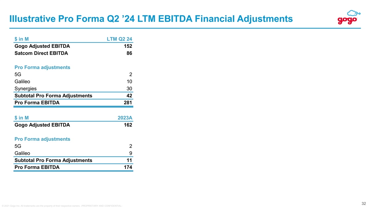 Illustrative Pro Forma Q2 ’24 LTM EBITDA Financial Adjustments $ in M LTM Q2 24 Gogo Adjusted EBITDA 152 Satcom Direct EBITDA 86 Pro Forma adjustments 5G 2 Galileo 10 Synergies 30 Subtotal Pro Forma Adjustments 42 Pro Forma EBITDA 281 $ in M 2023A Gogo Adjusted EBITDA 162 Pro Forma adjustments 5G 2 Galileo 9 Subtotal Pro Forma Adjustments 11 Pro Forma EBITDA 174 32 © 2021 Gogo Inc. All trademarks are the property of their respective owners. -PROPRIETARY AND CONFIDENTIAL-
