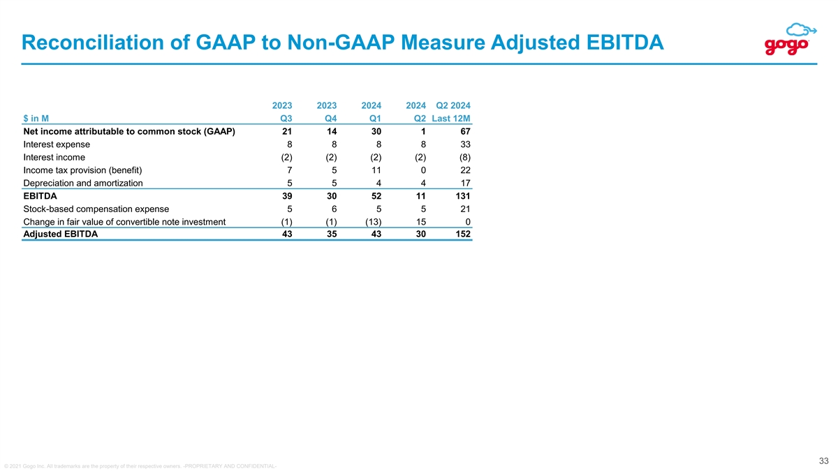 Reconciliation of GAAP to Non-GAAP Measure Adjusted EBITDA 2023 2023 2024 2024 Q2 2024 $ in M Q3 Q4 Q1 Q2 Last 12M Net income attributable to common stock (GAAP) 21 14 30 1 67 Interest expense 8 8 8 8 33 Interest income (2) (2) (2) (2) (8) Income tax provision (benefit) 7 5 11 0 22 Depreciation and amortization 5 5 4 4 17 EBITDA 39 30 52 11 131 Stock-based compensation expense 5 6 5 5 21 Change in fair value of convertible note investment (1) (1) (13) 15 0 Adjusted EBITDA 43 35 43 30 152 33 © 2021 Gogo Inc. All trademarks are the property of their respective owners. -PROPRIETARY AND CONFIDENTIAL-