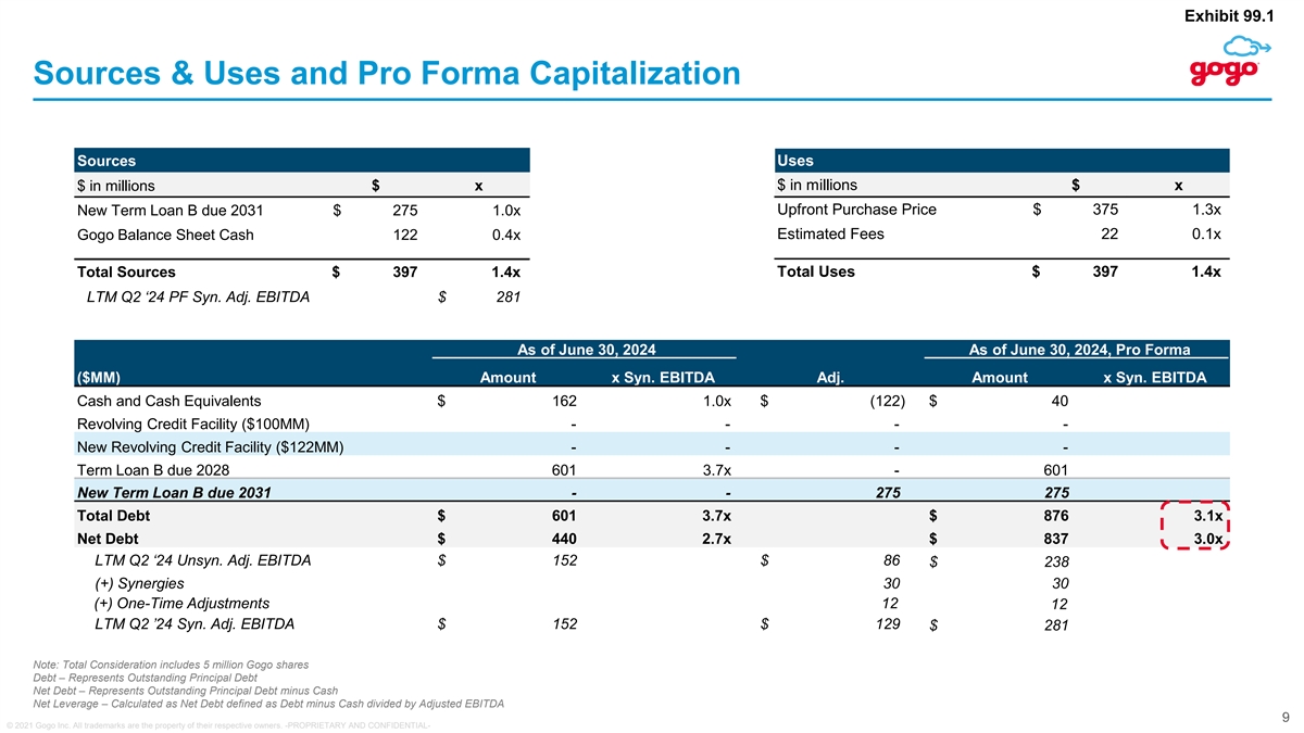 Exhibit 99.1 Sources & Uses and Pro Forma Capitalization Sources Uses $ in millions $ x $ in millions $ x Upfront Purchase Price $ 375 1.3x New Term Loan B due 2031 $ 275 1.0x Estimated Fees 22 0.1x Gogo Balance Sheet Cash 122 0.4x Total Sources $ 397 1.4x Total Uses $ 397 1.4x LTM Q2 ‘24 PF Syn. Adj. EBITDA $ 281 As of June 30, 2024 As of June 30, 2024, Pro Forma ($MM) Amount x Syn. EBITDA Adj. Amount x Syn. EBITDA Cash and Cash Equivalents $ 162 1.0x $ (122) $ 40 Revolving Credit Facility ($100MM) - - - - New Revolving Credit Facility ($122MM) - - - - Term Loan B due 2028 601 3.7x - 601 New Term Loan B due 2031 - - 275 275 Total Debt $ 601 3.7x $ 876 3.1x Net Debt $ 440 2.7x $ 837 3.0x LTM Q2 ‘24 Unsyn. Adj. EBITDA $ 152 $ 86 $ 238 (+) Synergies 30 30 (+) One-Time Adjustments 12 12 LTM Q2 ’24 Syn. Adj. EBITDA $ 152 $ 129 $ 281 Note: Total Consideration includes 5 million Gogo shares Debt – Represents Outstanding Principal Debt Net Debt – Represents Outstanding Principal Debt minus Cash Net Leverage – Calculated as Net Debt defined as Debt minus Cash divided by Adjusted EBITDA 9 © 2021 Gogo Inc. All trademarks are the property of their respective owners. -PROPRIETARY AND CONFIDENTIAL-