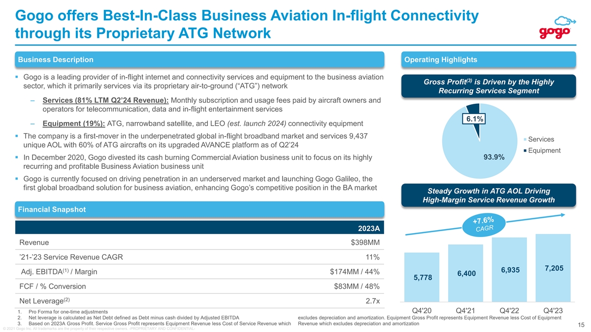 Gogo offers Best-In-Class Business Aviation In-flight Connectivity through its Proprietary ATG Network Business Description Operating Highlights § Gogo is a leading provider of in-flight internet and connectivity services and equipment to the business aviation (3) Gross Profit is Driven by the Highly sector, which it primarily services via its proprietary air-to-ground (“ATG”) network Recurring Services Segment – Services (81% LTM Q2’24 Revenue): Monthly subscription and usage fees paid by aircraft owners and operators for telecommunication, data and in-flight entertainment services 6.1% – Equipment (19%): ATG, narrowband satellite, and LEO (est. launch 2024) connectivity equipment § The company is a first-mover in the underpenetrated global in-flight broadband market and services 9,437 Services unique AOL with 60% of ATG aircrafts on its upgraded AVANCE platform as of Q2’24 Equipment § In December 2020, Gogo divested its cash burning Commercial Aviation business unit to focus on its highly 93.9% recurring and profitable Business Aviation business unit § Gogo is currently focused on driving penetration in an underserved market and launching Gogo Galileo, the first global broadband solution for business aviation, enhancing Gogo’s competitive position in the BA market Steady Growth in ATG AOL Driving High-Margin Service Revenue Growth Financial Snapshot 2023A Revenue $398MM ’21-’23 Service Revenue CAGR 11% 7,205 (1) 6,935 Adj. EBITDA / Margin $174MM / 44% 6,400 5,778 FCF / % Conversion $83MM / 48% (2) Net Leverage 2.7x 1. Pro Forma for one-time adjustments Q4'20 Q4'21 Q4'22 Q4'23 2. Net leverage is calculated as Net Debt defined as Debt minus cash divided by Adjusted EBITDA excludes depreciation and amortization. Equipment Gross Profit represents Equipment Revenue less Cost of Equipment 3. Based on 2023A Gross Profit. Service Gross Profit represents Equipment Revenue less Cost of Service Revenue which Revenue which excludes depreciation and amortization 15 © 2021 Gogo Inc. All trademarks are the property of their respective owners. -PROPRIETARY AND CONFIDENTIAL-