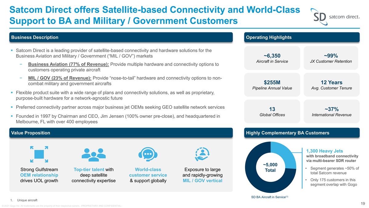 Satcom Direct offers Satellite-based Connectivity and World-Class Support to BA and Military / Government Customers Business Description Operating Highlights § Satcom Direct is a leading provider of satellite-based connectivity and hardware solutions for the Business Aviation and Military / Government (“MIL / GOV”) markets ~6,350 ~99% Aircraft in Service JX Customer Retention − Business Aviation (77% of Revenue): Provide multiple hardware and connectivity options to customers operating private aircraft − MIL / GOV (23% of Revenue): Provide “nose-to-tail” hardware and connectivity options to non- $255M 12 Years combat military and government aircrafts Pipeline Annual Value Avg. Customer Tenure § Flexible product suite with a wide range of plans and connectivity solutions, as well as proprietary, purpose-built hardware for a network-agnostic future § Preferred connectivity partner across major business jet OEMs seeking GEO satellite network services 13 ~37% Global Offices International Revenue § Founded in 1997 by Chairman and CEO, Jim Jensen (100% owner pre-close), and headquartered in Melbourne, FL with over 400 employees Value Proposition Highly Complementary BA Customers 1,300 Heavy Jets with broadband connectivity via multi-bearer SDR router ~5,000 • Segment generates ~50% of Strong Gulfstream Top-tier talent with World-class Exposure to large Total total Satcom revenue OEM relationship deep satellite customer service and rapidly-growing • Only 175 customers in this drives UOL growth connectivity expertise & support globally MIL / GOV vertical segment overlap with Gogo (1) SD BA Aircraft in Service 1. Unique aircraft 19 © 2021 Gogo Inc. All trademarks are the property of their respective owners. -PROPRIETARY AND CONFIDENTIAL-