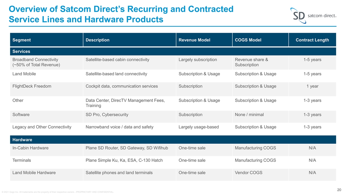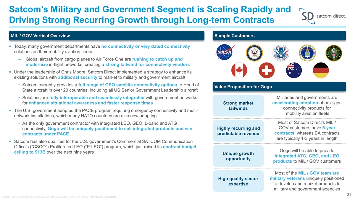 Overview of Satcom Direct’s Recurring and Contracted Service Lines and Hardware Products Segment Description Revenue Model COGS Model Contract Length Services Broadband Connectivity Satellite-based cabin connectivity Largely subscription Revenue share & 1-5 years (~50% of Total Revenue) Subscription Land Mobile Satellite-based land connectivity Subscription & Usage Subscription & Usage 1-5 years FlightDeck Freedom Cockpit data, communication services Subscription Subscription & Usage 1 year Other Data Center, DirecTV Management Fees, Subscription & Usage Subscription & Usage 1-3 years Training Software SD Pro, Cybersecurity Subscription None / minimal 1-3 years Legacy and Other Connectivity Narrowband voice / data and safety Largely usage-based Subscription & Usage 1-3 years Hardware In-Cabin Hardware Plane SD Router, SD Gateway, SD Wifihub One-time sale Manufacturing COGS N/A Terminals Plane Simple Ku, Ka, ESA, C-130 Hatch One-time sale Manufacturing COGS N/A Land Mobile Hardware Satellite phones and land terminals One-time sale Vendor COGS N/A 20 © 2021 Gogo Inc. All trademarks are the property of their respective owners. -PROPRIETARY AND CONFIDENTIAL-