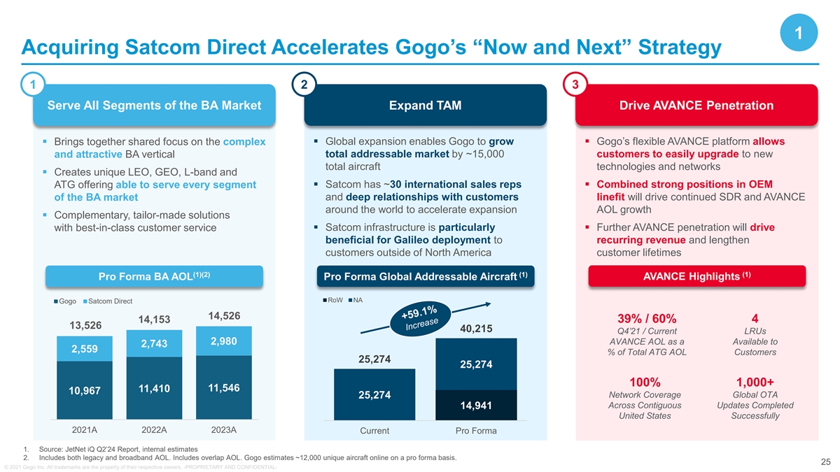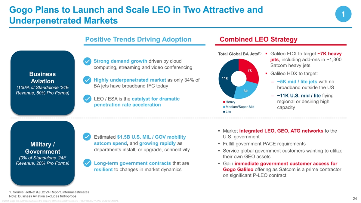 Gogo Plans to Launch and Scale LEO in Two Attractive and 1 Underpenetrated Markets Positive Trends Driving Adoption Combined LEO Strategy (1) Total Global BA Jets§ Galileo FDX to target ~7K heavy jets, including add-ons in ~1,300 Strong demand growth driven by cloud Satcom heavy jets computing, streaming and video conferencing 7k § Galileo HDX to target: Business 11k Highly underpenetrated market as only 34% of Aviation – ~5K mid / lite jets with no BA jets have broadband IFC today (100% of Standalone ’24E broadband outside the US 6k Revenue, 80% Pro Forma) – ~11K U.S. mid / lite flying LEO / ESA is the catalyst for dramatic Heavy regional or desiring high penetration rate acceleration Medium/Super-Mid capacity Lite § Market integrated LEO, GEO, ATG networks to the U.S. government Estimated $1.5B U.S. MIL / GOV mobility satcom spend, and growing rapidly as § Fulfill government PACE requirements Military / departments install, or upgrade, connectivity § Service global government customers wanting to utilize Government their own GEO assets (0% of Standalone ’24E Revenue, 20% Pro Forma) Long-term government contracts that are § Gain immediate government customer access for resilient to changes in market dynamics Gogo Galileo offering as Satcom is a prime contractor on significant P-LEO contract 1. Source: JetNet iQ Q2’24 Report, internal estimates Note: Business Aviation excludes turboprops 24 © 2021 Gogo Inc. All trademarks are the property of their respective owners. -PROPRIETARY AND CONFIDENTIAL-