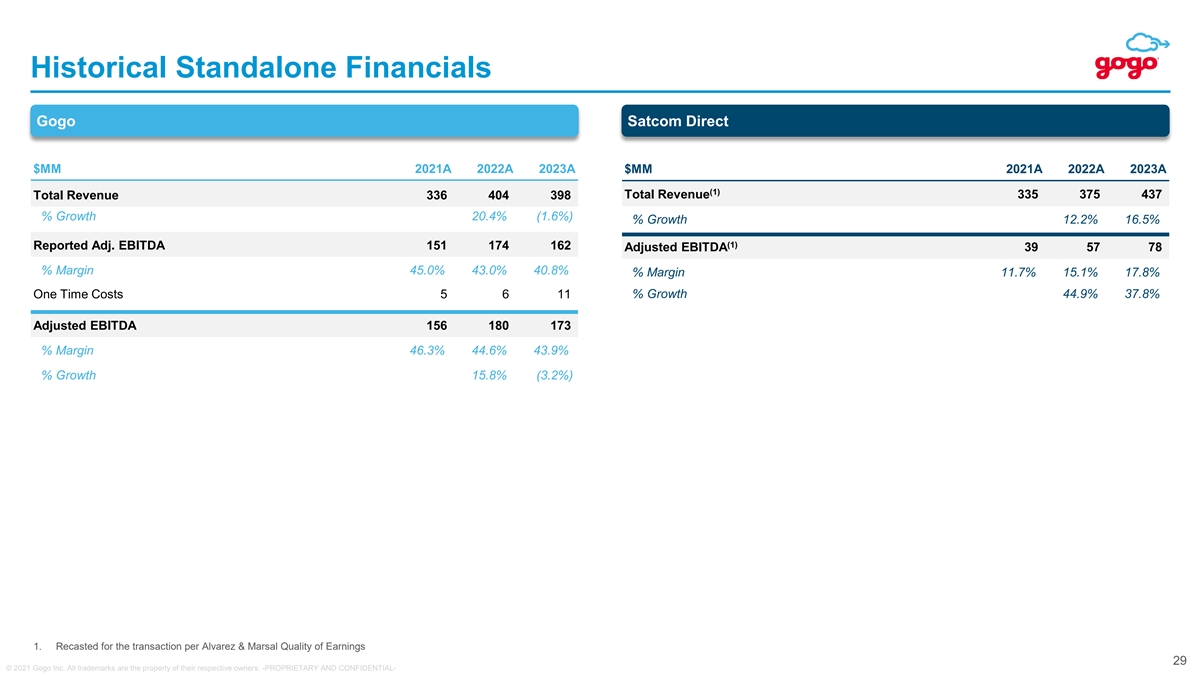 Historical Standalone Financials Gogo Satcom Direct $MM 2021A 2022A 2023A $MM 2021A 2022A 2023A (1) Total Revenue 335 375 437 Total Revenue 336 404 398 % Growth 20.4% (1.6%) % Growth 12.2% 16.5% (1) Reported Adj. EBITDA 151 174 162 Adjusted EBITDA 39 57 78 % Margin 45.0% 43.0% 40.8% % Margin 11.7% 15.1% 17.8% One Time Costs 5 6 11 % Growth 44.9% 37.8% Adjusted EBITDA 156 180 173 % Margin 46.3% 44.6% 43.9% % Growth 15.8% (3.2%) 1. Recasted for the transaction per Alvarez & Marsal Quality of Earnings 29 © 2021 Gogo Inc. All trademarks are the property of their respective owners. -PROPRIETARY AND CONFIDENTIAL-