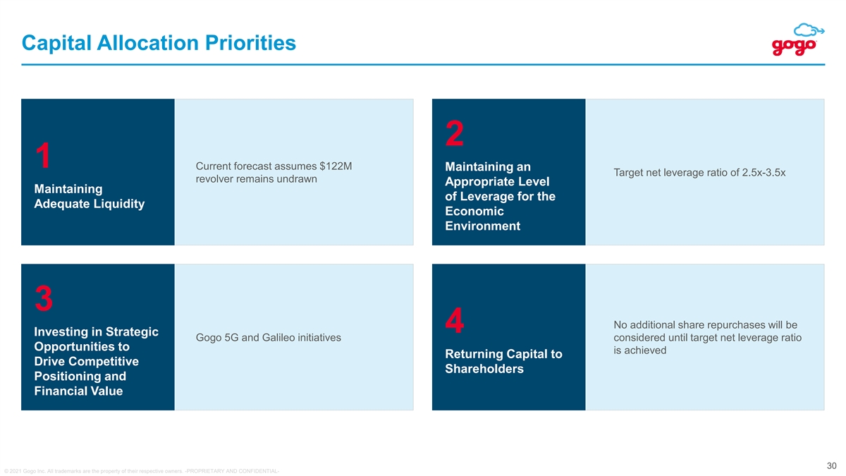 Capital Allocation Priorities 2 1 Current forecast assumes $122M Maintaining an Target net leverage ratio of 2.5x-3.5x revolver remains undrawn Appropriate Level Maintaining of Leverage for the Adequate Liquidity Economic Environment 3 No additional share repurchases will be 4 Investing in Strategic Gogo 5G and Galileo initiatives considered until target net leverage ratio Opportunities to is achieved Returning Capital to Drive Competitive Shareholders Positioning and Financial Value 30 © 2021 Gogo Inc. All trademarks are the property of their respective owners. -PROPRIETARY AND CONFIDENTIAL-