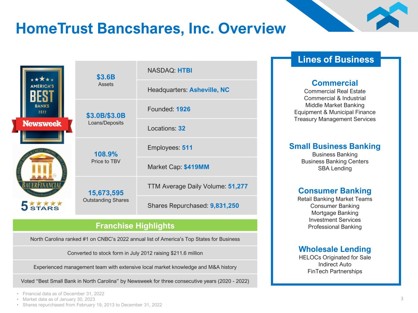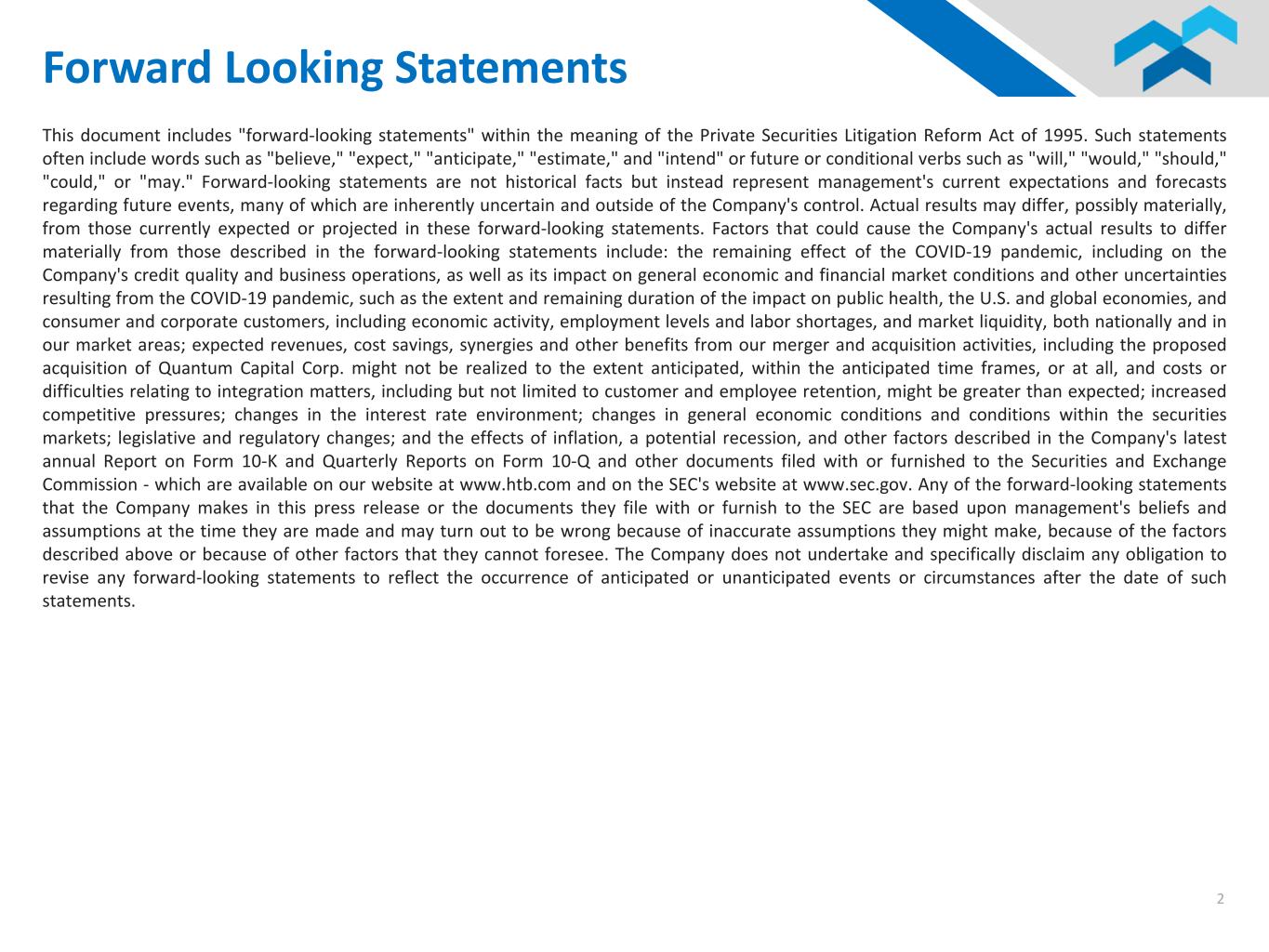 This document includes "forward-looking statements" within the meaning of the Private Securities Litigation Reform Act of 1995. Such statements often include words such as "believe," "expect," "anticipate," "estimate," and "intend" or future or conditional verbs such as "will," "would," "should," "could," or "may." Forward-looking statements are not historical facts but instead represent management's current expectations and forecasts regarding future events, many of which are inherently uncertain and outside of the Company's control. Actual results may differ, possibly materially, from those currently expected or projected in these forward-looking statements. Factors that could cause the Company's actual results to differ materially from those described in the forward-looking statements include: the remaining effect of the COVID-19 pandemic, including on the Company's credit quality and business operations, as well as its impact on general economic and financial market conditions and other uncertainties resulting from the COVID-19 pandemic, such as the extent and remaining duration of the impact on public health, the U.S. and global economies, and consumer and corporate customers, including economic activity, employment levels and labor shortages, and market liquidity, both nationally and in our market areas; expected revenues, cost savings, synergies and other benefits from our merger and acquisition activities, including the proposed acquisition of Quantum Capital Corp. might not be realized to the extent anticipated, within the anticipated time frames, or at all, and costs or difficulties relating to integration matters, including but not limited to customer and employee retention, might be greater than expected; increased competitive pressures; changes in the interest rate environment; changes in general economic conditions and conditions within the securities markets; legislative and regulatory changes; and the effects of inflation, a potential recession, and other factors described in the Company's latest annual Report on Form 10-K and Quarterly Reports on Form 10-Q and other documents filed with or furnished to the Securities and Exchange Commission - which are available on our website at www.htb.com and on the SEC's website at www.sec.gov. Any of the forward-looking statements that the Company makes in this press release or the documents they file with or furnish to the SEC are based upon management's beliefs and assumptions at the time they are made and may turn out to be wrong because of inaccurate assumptions they might make, because of the factors described above or because of other factors that they cannot foresee. The Company does not undertake and specifically disclaim any obligation to revise any forward-looking statements to reflect the occurrence of anticipated or unanticipated events or circumstances after the date of such statements. Forward Looking Statements 2