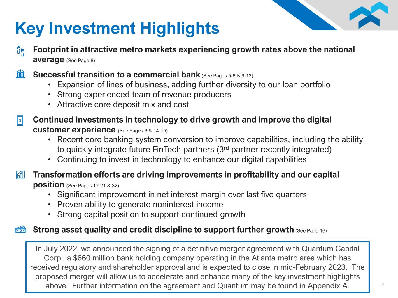 4 Footprint in attractive metro markets experiencing growth rates above the national average (See Page 8) Successful transition to a commercial bank (See Pages 5-6 & 9-13) • Expansion of lines of business, adding further diversity to our loan portfolio • Strong experienced team of revenue producers • Attractive core deposit mix and cost Continued investments in technology to drive growth and improve the digital customer experience (See Pages 6 & 14-15) • Recent core banking system conversion to improve capabilities, including the ability to quickly integrate future FinTech partners (3rd partner recently integrated) • Continuing to invest in technology to enhance our digital capabilities Transformation efforts are driving improvements in profitability and our capital position (See Pages 17-21 & 32) • Significant improvement in net interest margin over last five quarters • Proven ability to generate noninterest income • Strong capital position to support continued growth Strong asset quality and credit discipline to support further growth (See Page 16) $ Key Investment Highlights In July 2022, we announced the signing of a definitive merger agreement with Quantum Capital Corp., a $660 million bank holding company operating in the Atlanta metro area which has received regulatory and shareholder approval and is expected to close in mid-February 2023. The proposed merger will allow us to accelerate and enhance many of the key investment highlights above. Further information on the agreement and Quantum may be found in Appendix A.