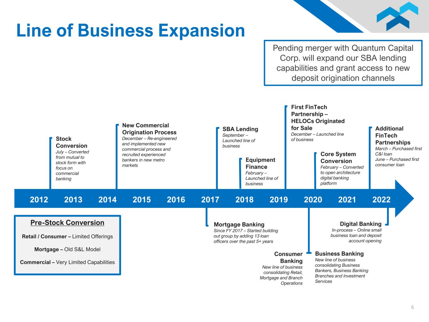5 Greenville, SC (2013) Tri-Cities and Knoxville, TN (2014) Charlotte, NC (2014) Roanoke, VA (2014) Raleigh, NC (2015) Re-engineered of CML LOB (2014) Introduced Indirect Auto (2014) Re-engineered Mtg LOB (2016) Re-engineered Treasury Mgmt (2016) Introduced SBA and Equipment Finance (2018) Introduced Symmetry (HELOCs) and Business Banking (2019) High Performing Peer Funding Levels Increase Fee Income Deposit Verticals Pilot Deposit BDOs Business Banking Micro Business Lending Engaged Employees FinTech Partnerships Optimizing Processes Automation Maturing Lines of Business Expand Digital Channels Phase 1 Geographic Expansion 2013 - 2015 Phase 2 Line of Business Expansion 2014 - 2020 Phase 3 Deposit Growth 2021 - 2024 Phase 4 Business Transformation 2022 - 2024 Business Transformation: Phases of Progress