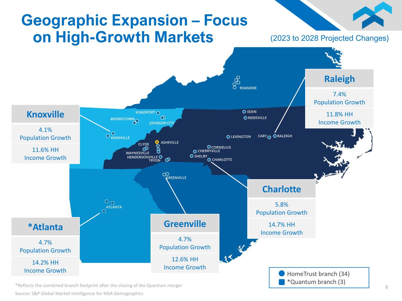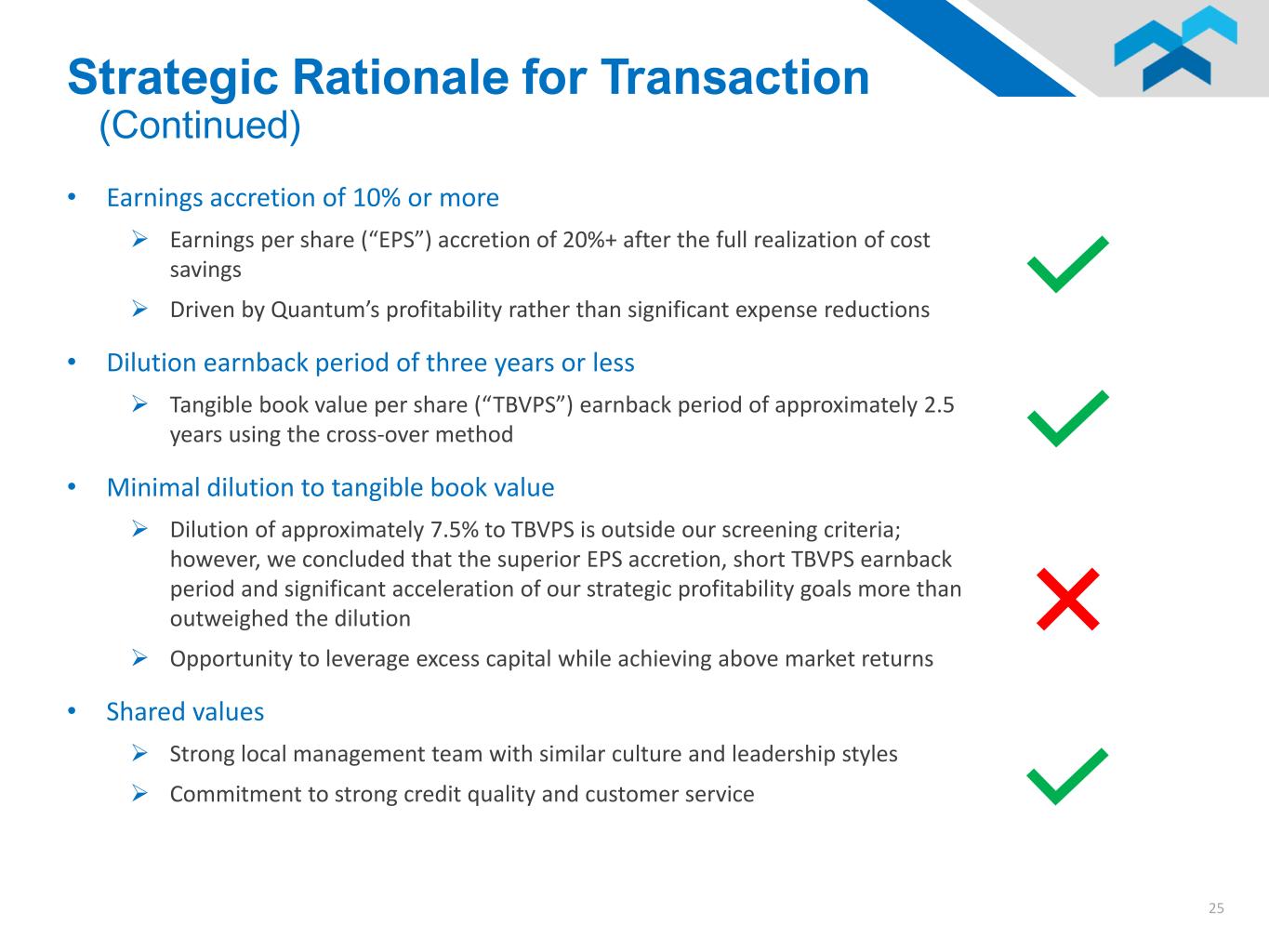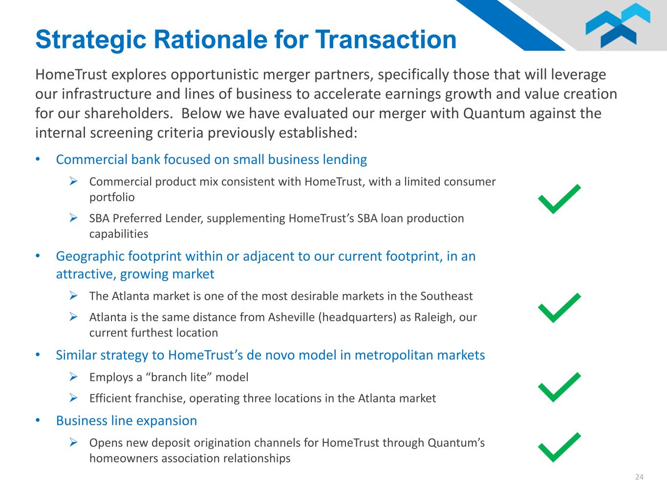 24 Strategic Rationale for Transaction HomeTrust explores opportunistic merger partners, specifically those that will leverage our infrastructure and lines of business to accelerate earnings growth and value creation for our shareholders. Below we have evaluated our merger with Quantum against the internal screening criteria previously established: • Commercial bank focused on small business lending ➢ Commercial product mix consistent with HomeTrust, with a limited consumer portfolio ➢ SBA Preferred Lender, supplementing HomeTrust’s SBA loan production capabilities • Geographic footprint within or adjacent to our current footprint, in an attractive, growing market ➢ The Atlanta market is one of the most desirable markets in the Southeast ➢ Atlanta is the same distance from Asheville (headquarters) as Raleigh, our current furthest location • Similar strategy to HomeTrust’s de novo model in metropolitan markets ➢ Employs a “branch lite” model ➢ Efficient franchise, operating three locations in the Atlanta market • Business line expansion ➢ Opens new deposit origination channels for HomeTrust through Quantum’s homeowners association relationships