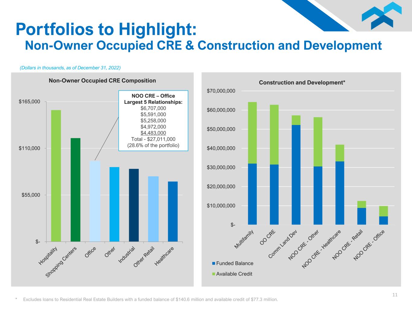 *Excludes PPP loans 10 $- $100,000 $200,000 $300,000 $400,000 $500,000 $600,000 $700,000 $800,000 $900,000 Commercial RE (NOO) Commercial RE (OO) Construction and Development Equipment Finance Other Commercial 1-4 Family HELOCs and Other Consumer 2016 2017 2018 2019 2020 2021 2022 12/31/22 (Dollars in thousands, by fiscal year) Total Loan Composition: 2016 - $1,763,113 2017 - $2,254,325 2018 - $2,416,885 2019 - $2,601,941 2020 - $2,598,685 2021 - $2,694,295 2022 - $2,768,634 12/31/22- $2,985,409 Loan Portfolio Transformation: Transition to a Commercial Bank