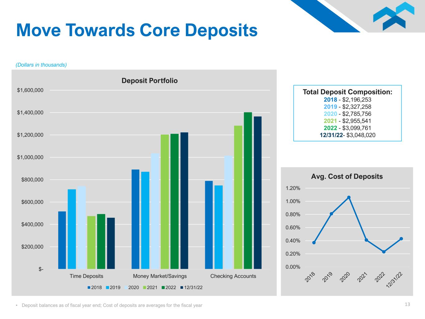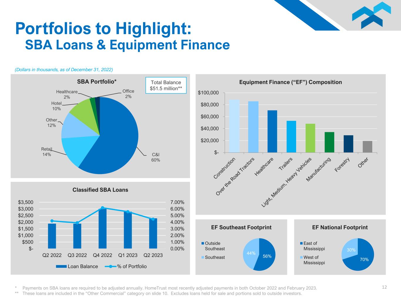 12 Portfolios to Highlight: SBA Loans & Equipment Finance * Payments on SBA loans are required to be adjusted annually. HomeTrust most recently adjusted payments in both October 2022 and February 2023. ** These loans are included in the “Other Commercial” category on slide 10. Excludes loans held for sale and portions sold to outside investors. C&I 60% Retail 14% Other 12% Hotel 10% Healthcare 2% Office 2% SBA Portfolio* 0.00% 1.00% 2.00% 3.00% 4.00% 5.00% 6.00% 7.00% $- $500 $1,000 $1,500 $2,000 $2,500 $3,000 $3,500 Q2 2022 Q3 2022 Q4 2022 Q1 2023 Q2 2023 Classified SBA Loans Loan Balance % of Portfolio Total Balance $51.5 million** (Dollars in thousands, as of December 31, 2022) $- $20,000 $40,000 $60,000 $80,000 $100,000 Equipment Finance (“EF”) Composition 56% 44% EF Southeast Footprint Outside Southeast Southeast 70% 30% EF National Footprint East of Mississippi West of Mississippi
