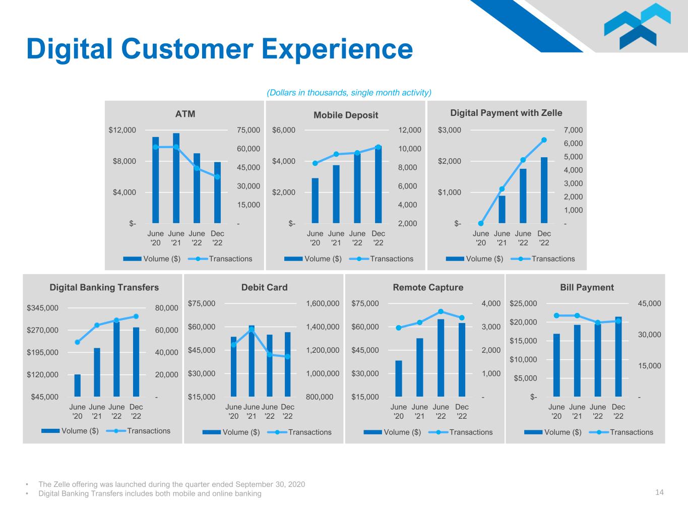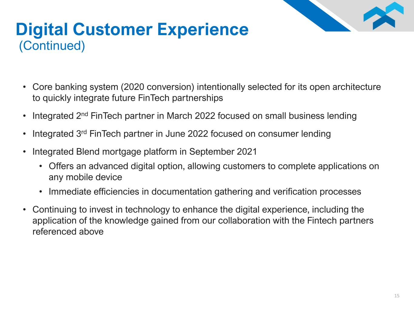 • The Zelle offering was launched during the quarter ended September 30, 2020 • Digital Banking Transfers includes both mobile and online banking 14 - 20,000 40,000 60,000 80,000 $45,000 $120,000 $195,000 $270,000 $345,000 June '20 June '21 June '22 Dec '22 Digital Banking Transfers Volume ($) Transactions (Dollars in thousands, single month activity) Digital Customer Experience 800,000 1,000,000 1,200,000 1,400,000 1,600,000 $15,000 $30,000 $45,000 $60,000 $75,000 June '20 June '21 June '22 Dec '22 Debit Card Volume ($) Transactions - 1,000 2,000 3,000 4,000 $15,000 $30,000 $45,000 $60,000 $75,000 June '20 June '21 June '22 Dec '22 Remote Capture Volume ($) Transactions - 15,000 30,000 45,000 $- $5,000 $10,000 $15,000 $20,000 $25,000 June '20 June '21 June '22 Dec '22 Bill Payment Volume ($) Transactions - 15,000 30,000 45,000 60,000 75,000 $- $4,000 $8,000 $12,000 June '20 June '21 June '22 Dec '22 ATM Volume ($) Transactions 2,000 4,000 6,000 8,000 10,000 12,000 $- $2,000 $4,000 $6,000 June '20 June '21 June '22 Dec '22 Mobile Deposit Volume ($) Transactions - 1,000 2,000 3,000 4,000 5,000 6,000 7,000 $- $1,000 $2,000 $3,000 June '20 June '21 June '22 Dec '22 Digital Payment with Zelle Volume ($) Transactions