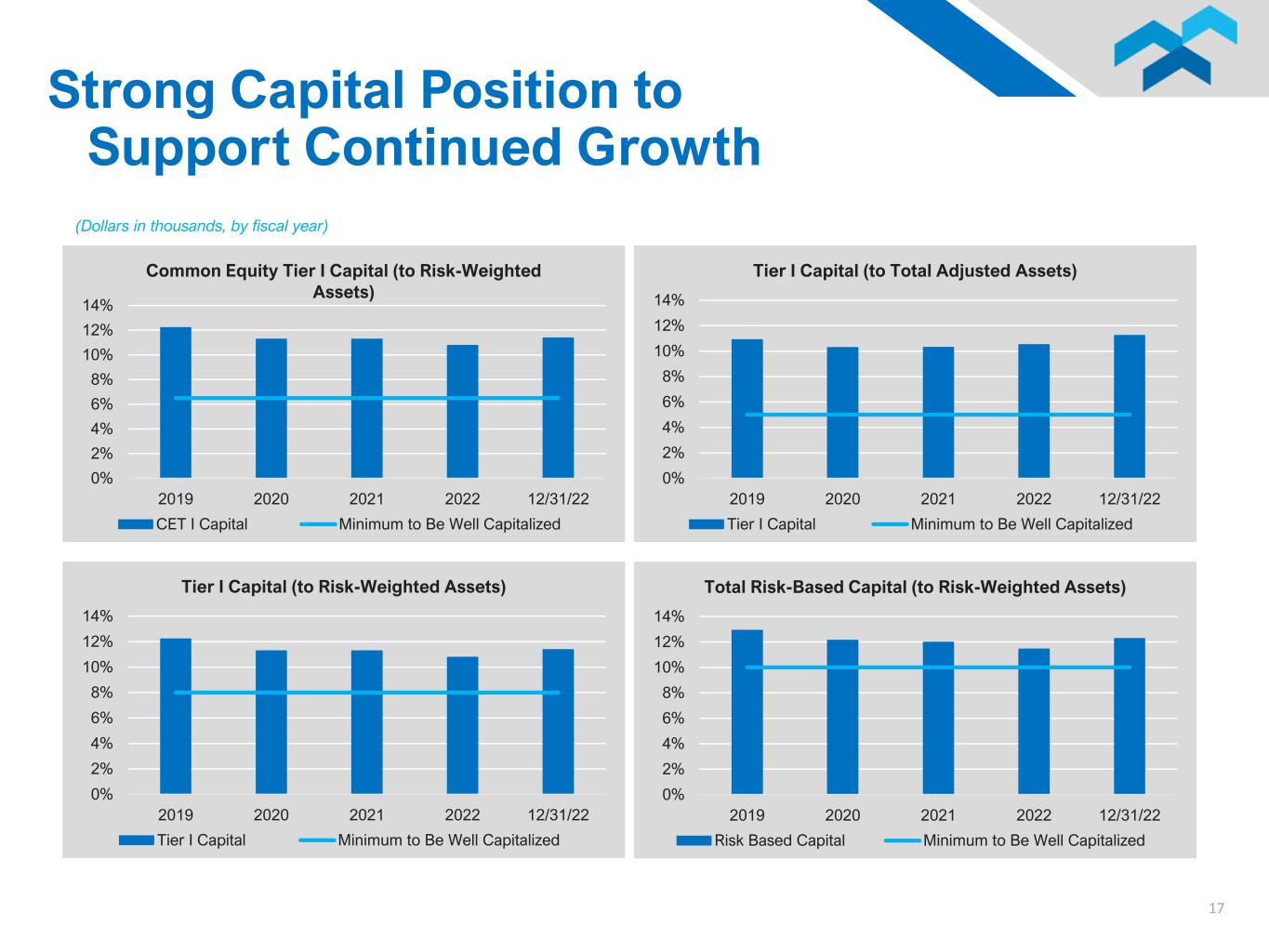 * Includes $6 million charge-off for one commercial relationship. Excluding that charge-off, the Bank had net recoveries of $669,000. ** Reflects the adoption of CECL on July 1, 2020. 16 -0.05% 0.00% 0.05% 0.10% 0.15% 0.20% 0.25% $(1,000) $1,000 $3,000 $5,000 $7,000 2019* 2020 2021 2022 12/31/22 Net Charge-Offs (“NCO”) and NCO to Average Loans Net Charge-Offs (Recoveries) NCO/Avg. Loans 0.00% 0.50% 1.00% 1.50% $- $10,000 $20,000 $30,000 $40,000 $50,000 2019 2020 2021** 2022 12/31/22 Allowance for Credit Losses (“ACL”) and ACL to Total Loans ACL ACL/Total Loans 0.10% 0.20% 0.30% 0.40% 0.50% 2019 2020 2021 2022 12/31/22 Nonperforming Assets to Total Assets 0% 150% 300% 450% 600% 750% 2019 2020 2021** 2022 12/31/22 ACL to Nonperforming Loans (Coverage Ratio) (Dollars in thousands, by fiscal year) Strong Asset Quality and Credit Discipline