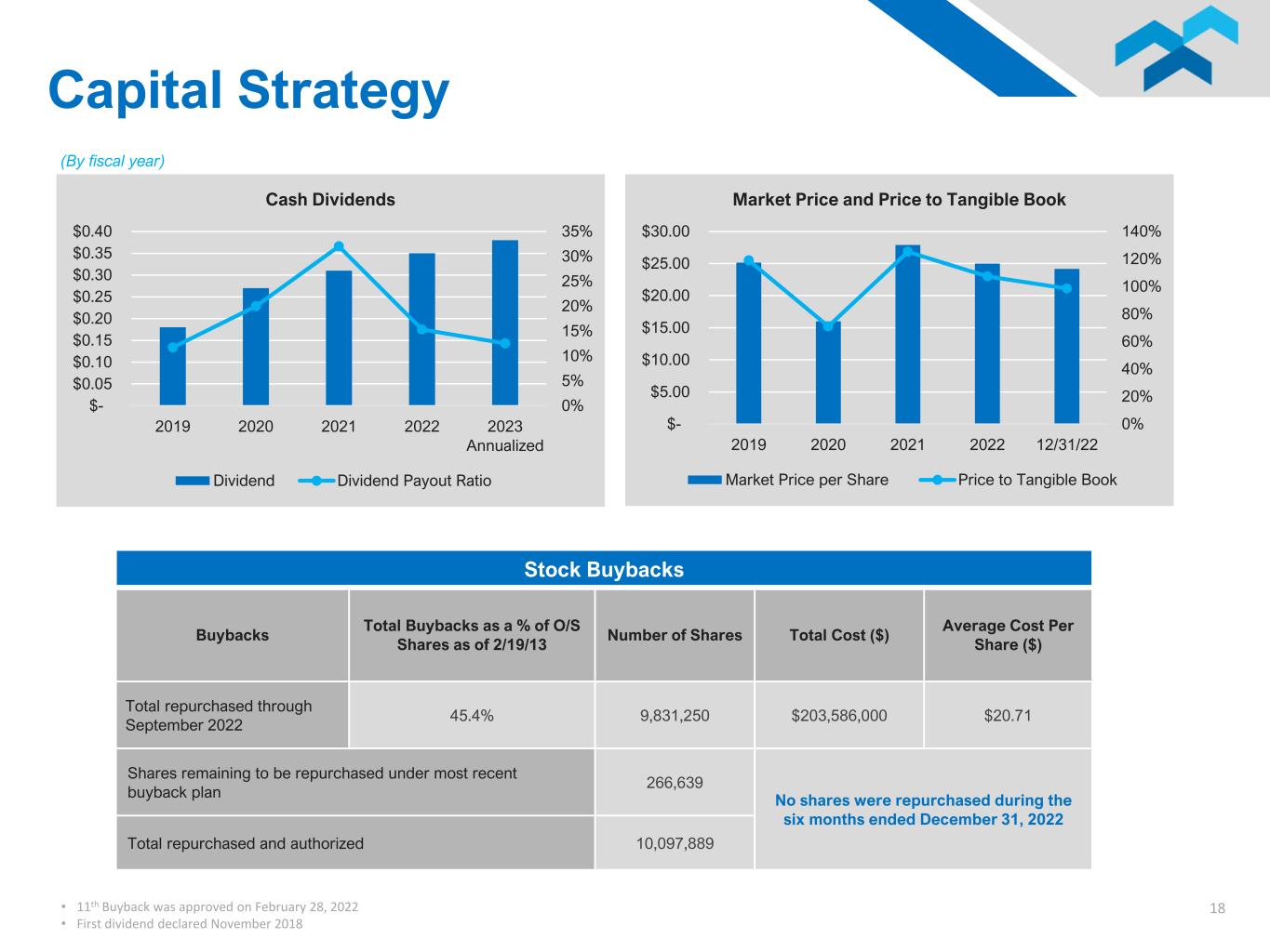 17 0% 2% 4% 6% 8% 10% 12% 14% 2019 2020 2021 2022 12/31/22 Common Equity Tier I Capital (to Risk-Weighted Assets) CET I Capital Minimum to Be Well Capitalized (Dollars in thousands, by fiscal year) 0% 2% 4% 6% 8% 10% 12% 14% 2019 2020 2021 2022 12/31/22 Tier I Capital (to Total Adjusted Assets) Tier I Capital Minimum to Be Well Capitalized 0% 2% 4% 6% 8% 10% 12% 14% 2019 2020 2021 2022 12/31/22 Tier I Capital (to Risk-Weighted Assets) Tier I Capital Minimum to Be Well Capitalized 0% 2% 4% 6% 8% 10% 12% 14% 2019 2020 2021 2022 12/31/22 Total Risk-Based Capital (to Risk-Weighted Assets) Risk Based Capital Minimum to Be Well Capitalized Strong Capital Position to Support Continued Growth