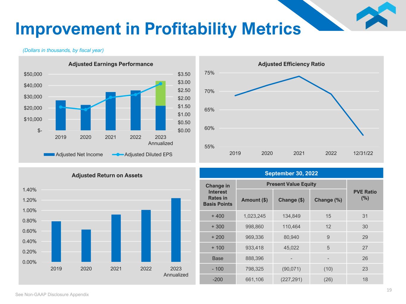 19 $0.00 $0.50 $1.00 $1.50 $2.00 $2.50 $3.00 $3.50 $- $10,000 $20,000 $30,000 $40,000 $50,000 2019 2020 2021 2022 2023 Annualized Adjusted Earnings Performance Adjusted Net Income Adjusted Diluted EPS 0.00% 0.20% 0.40% 0.60% 0.80% 1.00% 1.20% 1.40% 2019 2020 2021 2022 2023 Annualized Adjusted Return on Assets (Dollars in thousands, by fiscal year) September 30, 2022 Change in Interest Rates in Basis Points Present Value Equity PVE Ratio (%)Amount ($) Change ($) Change (%) + 400 1,023,245 134,849 15 31 + 300 998,860 110,464 12 30 + 200 969,336 80,940 9 29 + 100 933,418 45,022 5 27 Base 888,396 - - 26 - 100 798,325 (90,071) (10) 23 -200 661,106 (227,291) (26) 18 55% 60% 65% 70% 75% 2019 2020 2021 2022 12/31/22 Adjusted Efficiency Ratio Improvement in Profitability Metrics See Non-GAAP Disclosure Appendix