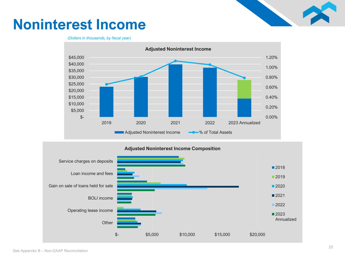 20 0.00% 0.20% 0.40% 0.60% 0.80% 1.00% 1.20% $- $5,000 $10,000 $15,000 $20,000 $25,000 $30,000 $35,000 $40,000 $45,000 2019 2020 2021 2022 2023 Annualized Adjusted Noninterest Income Adjusted Noninterest Income % of Total Assets Service charges on deposits Loan income and fees Gain on sale of loans held for sale BOLI income Operating lease income Other $- $5,000 $10,000 $15,000 $20,000 Adjusted Noninterest Income Composition 2018 2019 2020 2021 2022 2023 Annualized (Dollars in thousands, by fiscal year) Noninterest Income See Appendix B – Non-GAAP Reconciliation