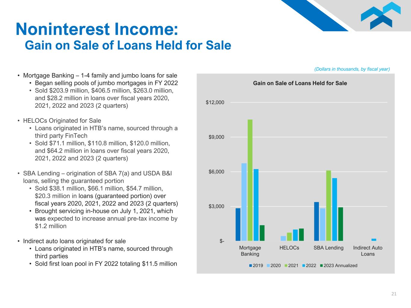 21 • Mortgage Banking – 1-4 family and jumbo loans for sale • Began selling pools of jumbo mortgages in FY 2022 • Sold $203.9 million, $406.5 million, $263.0 million, and $28.2 million in loans over fiscal years 2020, 2021, 2022 and 2023 (2 quarters) • HELOCs Originated for Sale • Loans originated in HTB’s name, sourced through a third party FinTech • Sold $71.1 million, $110.8 million, $120.0 million, and $64.2 million in loans over fiscal years 2020, 2021, 2022 and 2023 (2 quarters) • SBA Lending – origination of SBA 7(a) and USDA B&I loans, selling the guaranteed portion • Sold $38.1 million, $66.1 million, $54.7 million, $20.3 million in loans (guaranteed portion) over fiscal years 2020, 2021, 2022 and 2023 (2 quarters) • Brought servicing in-house on July 1, 2021, which was expected to increase annual pre-tax income by $1.2 million • Indirect auto loans originated for sale • Loans originated in HTB’s name, sourced through third parties • Sold first loan pool in FY 2022 totaling $11.5 million (Dollars in thousands, by fiscal year) Noninterest Income: Gain on Sale of Loans Held for Sale $- $3,000 $6,000 $9,000 $12,000 Mortgage Banking HELOCs SBA Lending Indirect Auto Loans Gain on Sale of Loans Held for Sale 2019 2020 2021 2022 2023 Annualized