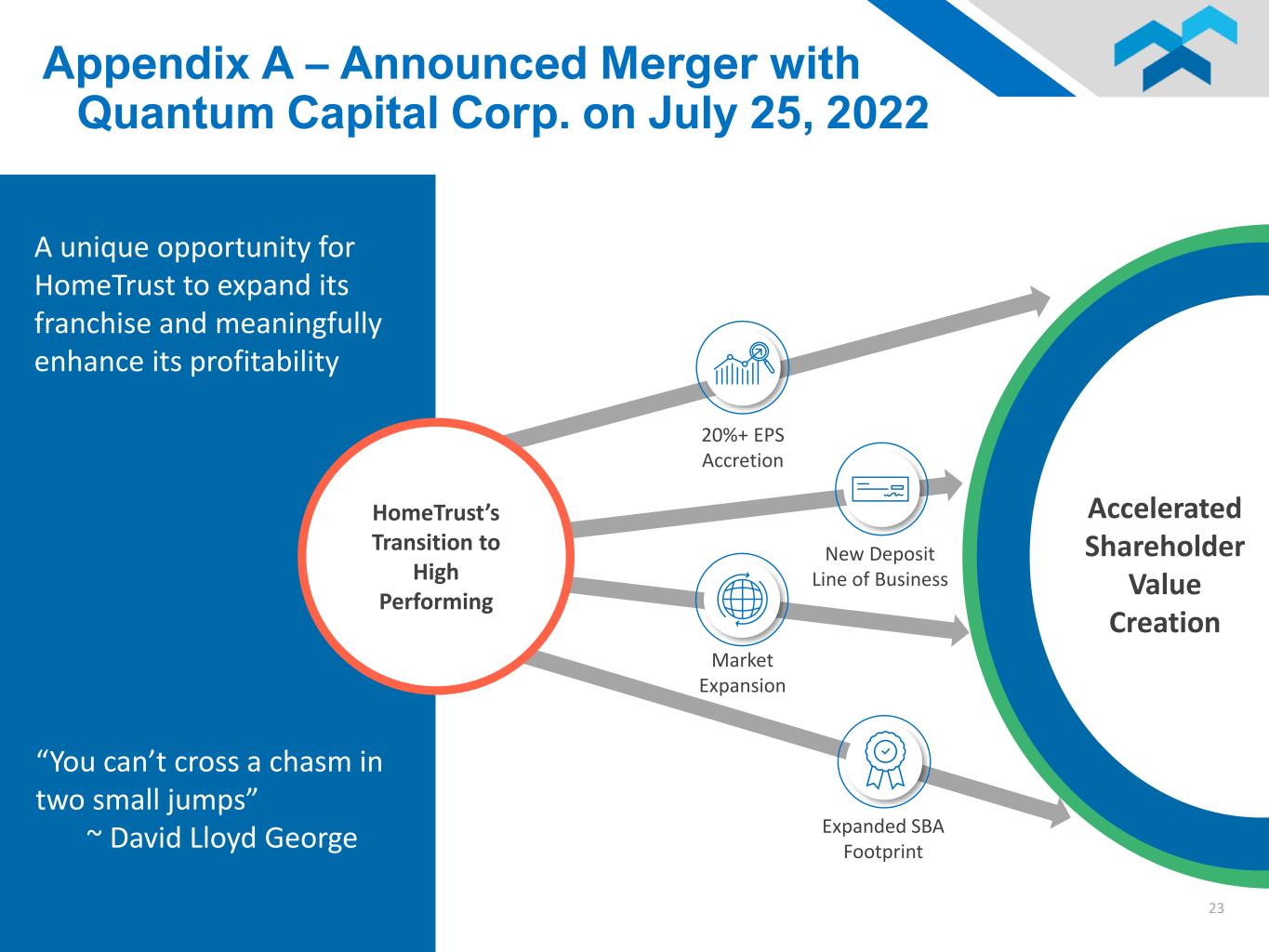 23 Accelerated Shareholder Value Creation HomeTrust’s Transition to High Performing Market Expansion 20%+ EPS Accretion Expanded SBA Footprint A unique opportunity for HomeTrust to expand its franchise and meaningfully enhance its profitability New Deposit Line of Business “You can’t cross a chasm in two small jumps” ~ David Lloyd George Appendix A – Announced Merger with Quantum Capital Corp. on July 25, 2022