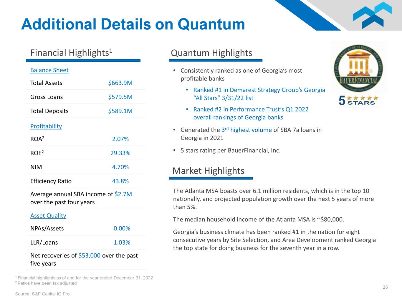 25 • Earnings accretion of 10% or more ➢ Earnings per share (“EPS”) accretion of 20%+ after the full realization of cost savings ➢ Driven by Quantum’s profitability rather than significant expense reductions • Dilution earnback period of three years or less ➢ Tangible book value per share (“TBVPS”) earnback period of approximately 2.5 years using the cross-over method • Minimal dilution to tangible book value ➢ Dilution of approximately 7.5% to TBVPS is outside our screening criteria; however, we concluded that the superior EPS accretion, short TBVPS earnback period and significant acceleration of our strategic profitability goals more than outweighed the dilution ➢ Opportunity to leverage excess capital while achieving above market returns • Shared values ➢ Strong local management team with similar culture and leadership styles ➢ Commitment to strong credit quality and customer service Strategic Rationale for Transaction (Continued)