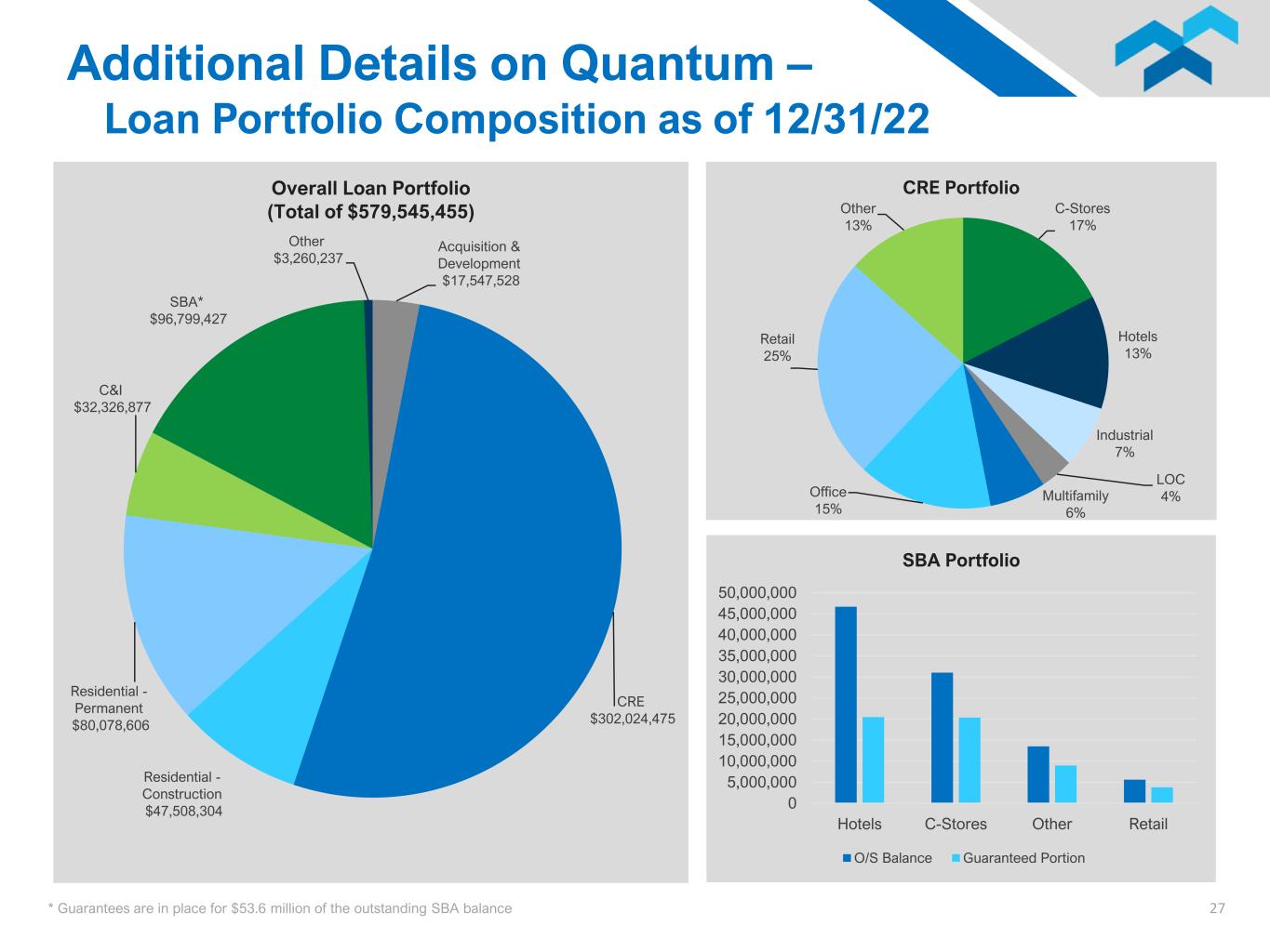 * Guarantees are in place for $53.6 million of the outstanding SBA balance 27 Additional Details on Quantum – Loan Portfolio Composition as of 12/31/22 Acquisition & Development $17,547,528 CRE $302,024,475 Residential - Construction $47,508,304 Residential - Permanent $80,078,606 C&I $32,326,877 SBA* $96,799,427 Other $3,260,237 Overall Loan Portfolio (Total of $579,545,455) C-Stores 17% Hotels 13% Industrial 7% LOC 4%Multifamily 6% Office 15% Retail 25% Other 13% CRE Portfolio 0 5,000,000 10,000,000 15,000,000 20,000,000 25,000,000 30,000,000 35,000,000 40,000,000 45,000,000 50,000,000 Hotels C-Stores Other Retail SBA Portfolio O/S Balance Guaranteed Portion