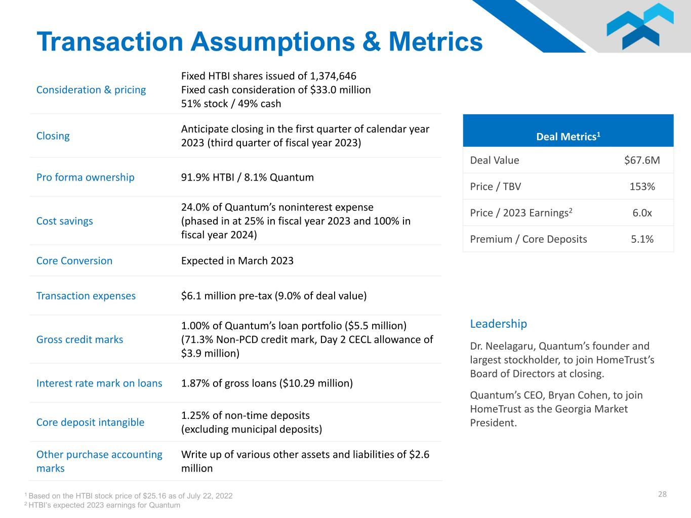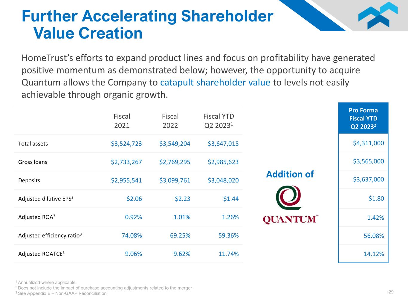 28 Consideration & pricing Fixed HTBI shares issued of 1,374,646 Fixed cash consideration of $33.0 million 51% stock / 49% cash Closing Anticipate closing in the first quarter of calendar year 2023 (third quarter of fiscal year 2023) Pro forma ownership 91.9% HTBI / 8.1% Quantum Cost savings 24.0% of Quantum’s noninterest expense (phased in at 25% in fiscal year 2023 and 100% in fiscal year 2024) Core Conversion Expected in March 2023 Transaction expenses $6.1 million pre-tax (9.0% of deal value) Gross credit marks 1.00% of Quantum’s loan portfolio ($5.5 million) (71.3% Non-PCD credit mark, Day 2 CECL allowance of $3.9 million) Interest rate mark on loans 1.87% of gross loans ($10.29 million) Core deposit intangible 1.25% of non-time deposits (excluding municipal deposits) Other purchase accounting marks Write up of various other assets and liabilities of $2.6 million Deal Metrics1 Deal Value $67.6M Price / TBV 153% Price / 2023 Earnings2 6.0x Premium / Core Deposits 5.1% Leadership Dr. Neelagaru, Quantum’s founder and largest stockholder, to join HomeTrust’s Board of Directors at closing. Quantum’s CEO, Bryan Cohen, to join HomeTrust as the Georgia Market President. Transaction Assumptions & Metrics 1 Based on the HTBI stock price of $25.16 as of July 22, 2022 2 HTBI’s expected 2023 earnings for Quantum