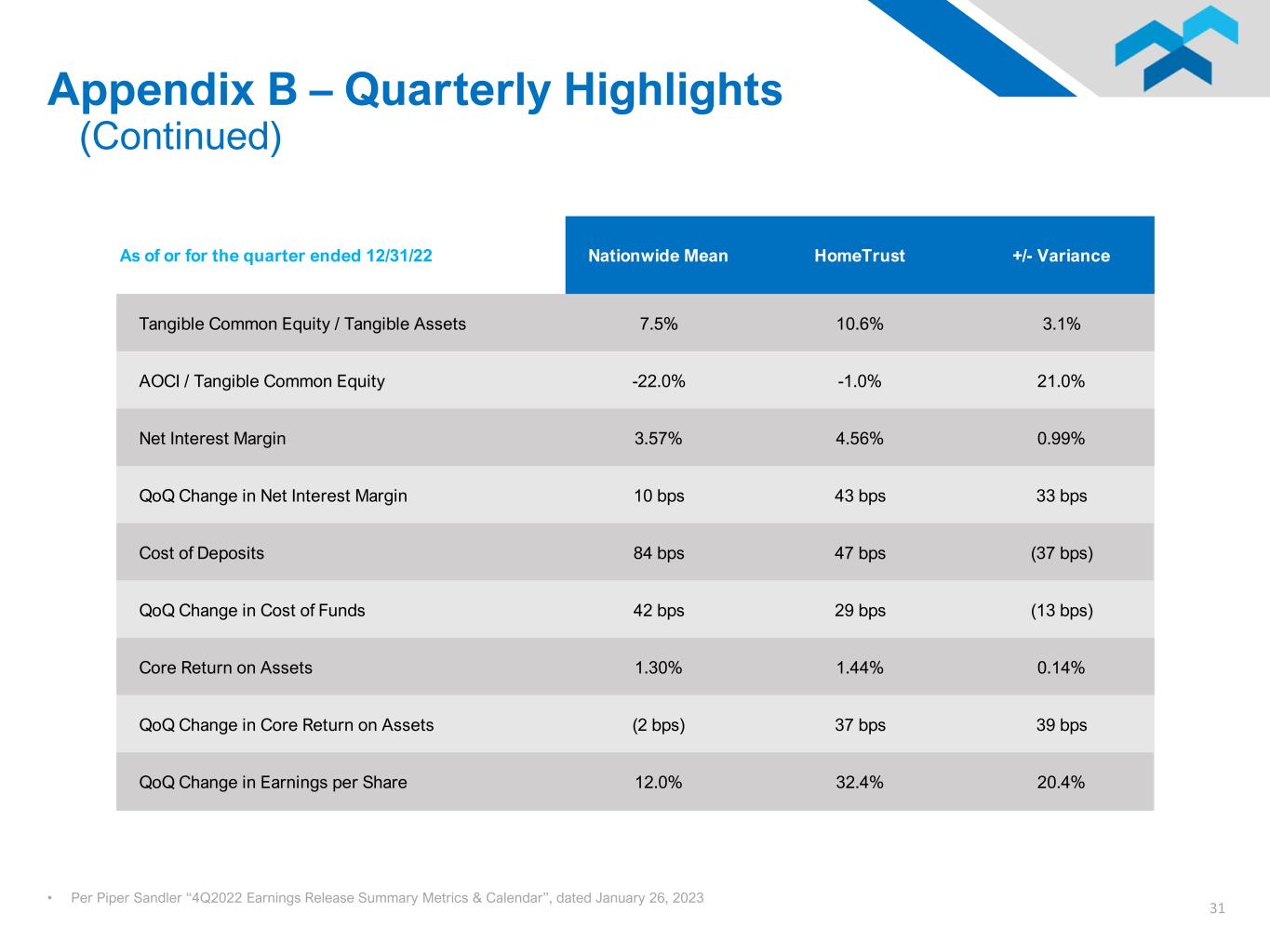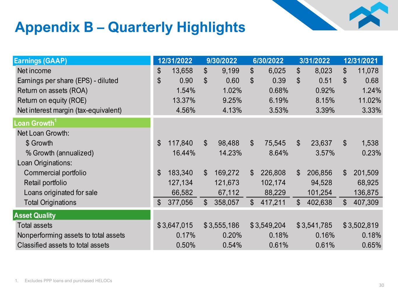 30 Earnings (GAAP) 12/31/2022 9/30/2022 6/30/2022 3/31/2022 12/31/2021 Net income 13,658$ 9,199$ 6,025$ 8,023$ 11,078$ Earnings per share (EPS) - diluted 0.90$ 0.60$ 0.39$ 0.51$ 0.68$ Return on assets (ROA) 1.54% 1.02% 0.68% 0.92% 1.24% Return on equity (ROE) 13.37% 9.25% 6.19% 8.15% 11.02% Net interest margin (tax-equivalent) 4.56% 4.13% 3.53% 3.39% 3.33% Loan Growth 1 Net Loan Growth: $ Growth 117,840$ 98,488$ 75,545$ 23,637$ 1,538$ % Growth (annualized) 16.44% 14.23% 8.64% 3.57% 0.23% Loan Originations: Commercial portfolio 183,340$ 169,272$ 226,808$ 206,856$ 201,509$ Retail portfolio 127,134 121,673 102,174 94,528 68,925 Loans originated for sale 66,582 67,112 88,229 101,254 136,875 Total Originations 377,056$ 358,057$ 417,211$ 402,638$ 407,309$ Asset Quality Total assets 3,647,015$ 3,555,186$ 3,549,204$ 3,541,785$ 3,502,819$ Nonperforming assets to total assets 0.17% 0.20% 0.18% 0.16% 0.18% Classified assets to total assets 0.50% 0.54% 0.61% 0.61% 0.65% Appendix B – Quarterly Highlights 1. Excludes PPP loans and purchased HELOCs