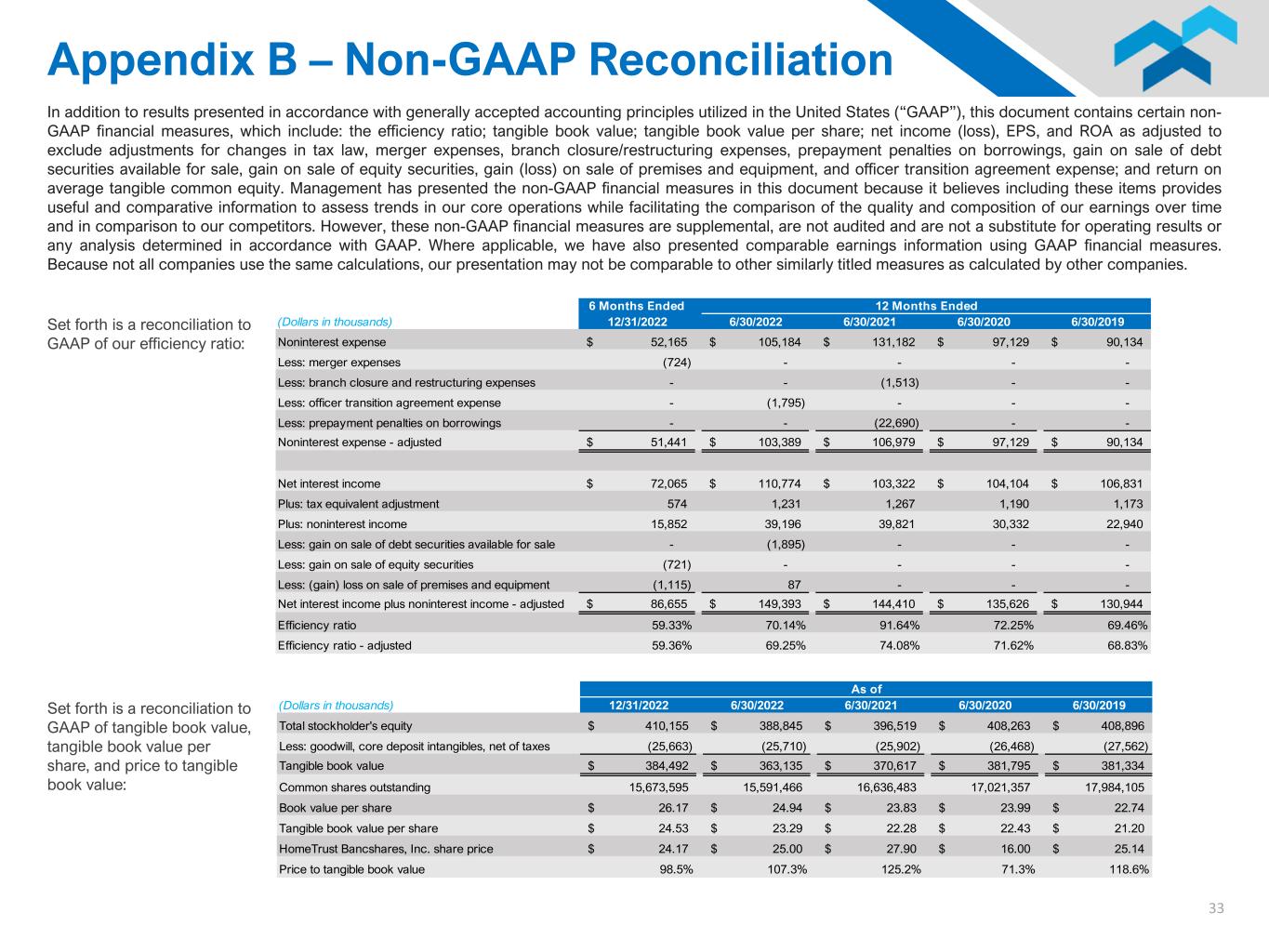 33 Set forth is a reconciliation to GAAP of our efficiency ratio: Set forth is a reconciliation to GAAP of tangible book value, tangible book value per share, and price to tangible book value: 6 Months Ended (Dollars in thousands) 12/31/2022 6/30/2022 6/30/2021 6/30/2020 6/30/2019 Noninterest expense 52,165$ 105,184$ 131,182$ 97,129$ 90,134$ Less: merger expenses (724) - - - - Less: branch closure and restructuring expenses - - (1,513) - - Less: officer transition agreement expense - (1,795) - - - Less: prepayment penalties on borrowings - - (22,690) - - Noninterest expense - adjusted 51,441$ 103,389$ 106,979$ 97,129$ 90,134$ Net interest income 72,065$ 110,774$ 103,322$ 104,104$ 106,831$ Plus: tax equivalent adjustment 574 1,231 1,267 1,190 1,173 Plus: noninterest income 15,852 39,196 39,821 30,332 22,940 Less: gain on sale of debt securities available for sale - (1,895) - - - Less: gain on sale of equity securities (721) - - - - Less: (gain) loss on sale of premises and equipment (1,115) 87 - - - Net interest income plus noninterest income - adjusted 86,655$ 149,393$ 144,410$ 135,626$ 130,944$ Efficiency ratio 59.33% 70.14% 91.64% 72.25% 69.46% Efficiency ratio - adjusted 59.36% 69.25% 74.08% 71.62% 68.83% 12 Months Ended (Dollars in thousands) 12/31/2022 6/30/2022 6/30/2021 6/30/2020 6/30/2019 Total stockholder's equity 410,155$ 388,845$ 396,519$ 408,263$ 408,896$ Less: goodwill, core deposit intangibles, net of taxes (25,663) (25,710) (25,902) (26,468) (27,562) Tangible book value 384,492$ 363,135$ 370,617$ 381,795$ 381,334$ Common shares outstanding 15,673,595 15,591,466 16,636,483 17,021,357 17,984,105 Book value per share 26.17$ 24.94$ 23.83$ 23.99$ 22.74$ Tangible book value per share 24.53$ 23.29$ 22.28$ 22.43$ 21.20$ HomeTrust Bancshares, Inc. share price 24.17$ 25.00$ 27.90$ 16.00$ 25.14$ Price to tangible book value 98.5% 107.3% 125.2% 71.3% 118.6% As of Appendix B – Non-GAAP Reconciliation In addition to results presented in accordance with generally accepted accounting principles utilized in the United States (“GAAP”), this document contains certain non- GAAP financial measures, which include: the efficiency ratio; tangible book value; tangible book value per share; net income (loss), EPS, and ROA as adjusted to exclude adjustments for changes in tax law, merger expenses, branch closure/restructuring expenses, prepayment penalties on borrowings, gain on sale of debt securities available for sale, gain on sale of equity securities, gain (loss) on sale of premises and equipment, and officer transition agreement expense; and return on average tangible common equity. Management has presented the non-GAAP financial measures in this document because it believes including these items provides useful and comparative information to assess trends in our core operations while facilitating the comparison of the quality and composition of our earnings over time and in comparison to our competitors. However, these non-GAAP financial measures are supplemental, are not audited and are not a substitute for operating results or any analysis determined in accordance with GAAP. Where applicable, we have also presented comparable earnings information using GAAP financial measures. Because not all companies use the same calculations, our presentation may not be comparable to other similarly titled measures as calculated by other companies.