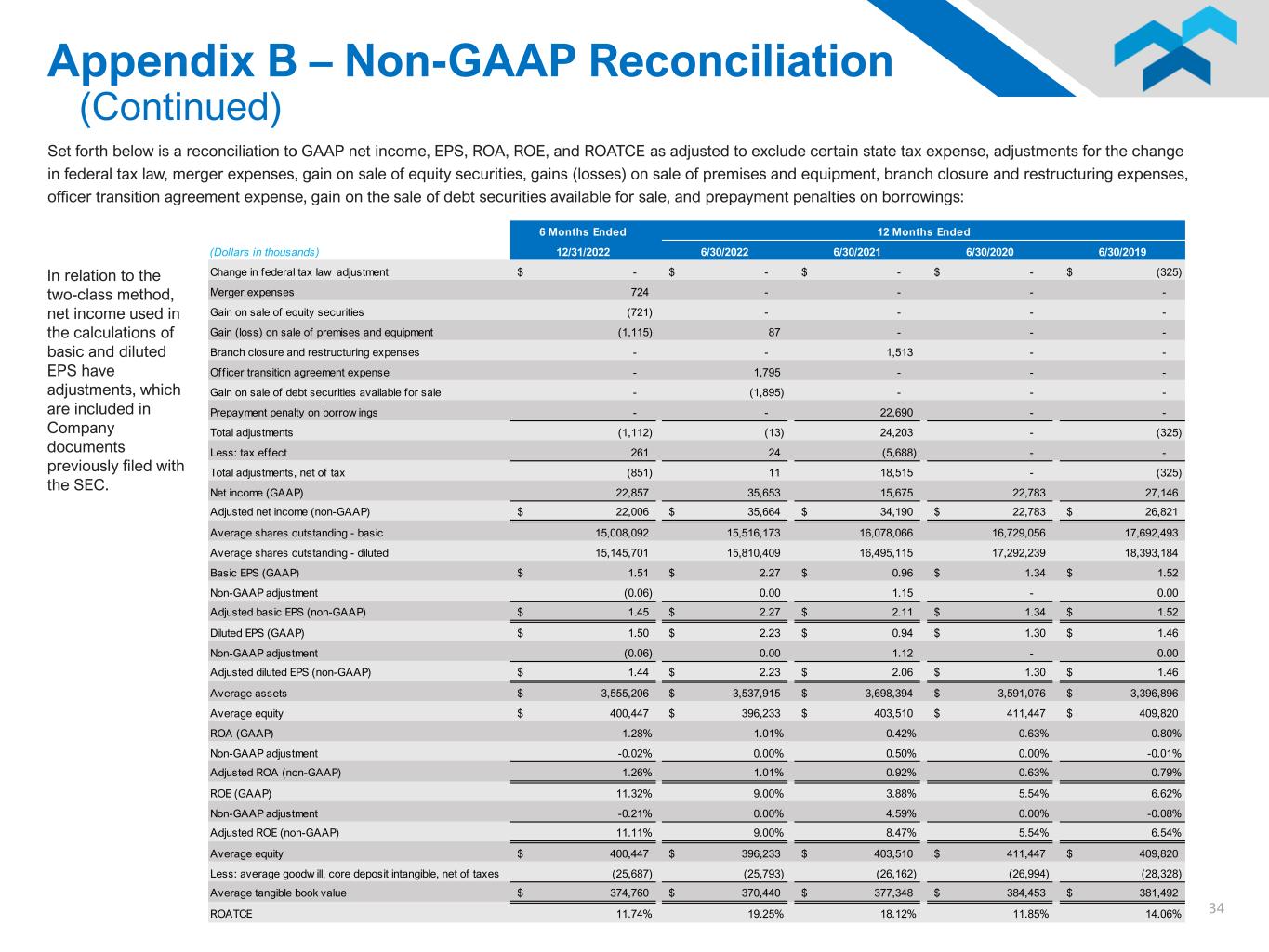 34 Set forth below is a reconciliation to GAAP net income, EPS, ROA, ROE, and ROATCE as adjusted to exclude certain state tax expense, adjustments for the change in federal tax law, merger expenses, gain on sale of equity securities, gains (losses) on sale of premises and equipment, branch closure and restructuring expenses, officer transition agreement expense, gain on the sale of debt securities available for sale, and prepayment penalties on borrowings: In relation to the two-class method, net income used in the calculations of basic and diluted EPS have adjustments, which are included in Company documents previously filed with the SEC. Appendix B – Non-GAAP Reconciliation (Continued) 6 Months Ended (Dollars in thousands) 12/31/2022 6/30/2022 6/30/2021 6/30/2020 6/30/2019 Change in federal tax law adjustment -$ -$ -$ -$ (325)$ Merger expenses 724 - - - - Gain on sale of equity securities (721) - - - - Gain (loss) on sale of premises and equipment (1,115) 87 - - - Branch closure and restructuring expenses - - 1,513 - - Off icer transition agreement expense - 1,795 - - - Gain on sale of debt securities available for sale - (1,895) - - - Prepayment penalty on borrow ings - - 22,690 - - Total adjustments (1,112) (13) 24,203 - (325) Less: tax effect 261 24 (5,688) - - Total adjustments, net of tax (851) 11 18,515 - (325) Net income (GAAP) 22,857 35,653 15,675 22,783 27,146 Adjusted net income (non-GAAP) 22,006$ 35,664$ 34,190$ 22,783$ 26,821$ Average shares outstanding - basic 15,008,092 15,516,173 16,078,066 16,729,056 17,692,493 Average shares outstanding - diluted 15,145,701 15,810,409 16,495,115 17,292,239 18,393,184 Basic EPS (GAAP) 1.51$ 2.27$ 0.96$ 1.34$ 1.52$ Non-GAAP adjustment (0.06) 0.00 1.15 - 0.00 Adjusted basic EPS (non-GAAP) 1.45$ 2.27$ 2.11$ 1.34$ 1.52$ Diluted EPS (GAAP) 1.50$ 2.23$ 0.94$ 1.30$ 1.46$ Non-GAAP adjustment (0.06) 0.00 1.12 - 0.00 Adjusted diluted EPS (non-GAAP) 1.44$ 2.23$ 2.06$ 1.30$ 1.46$ Average assets 3,555,206$ 3,537,915$ 3,698,394$ 3,591,076$ 3,396,896$ Average equity 400,447$ 396,233$ 403,510$ 411,447$ 409,820$ ROA (GAAP) 1.28% 1.01% 0.42% 0.63% 0.80% Non-GAAP adjustment -0.02% 0.00% 0.50% 0.00% -0.01% Adjusted ROA (non-GAAP) 1.26% 1.01% 0.92% 0.63% 0.79% ROE (GAAP) 11.32% 9.00% 3.88% 5.54% 6.62% Non-GAAP adjustment -0.21% 0.00% 4.59% 0.00% -0.08% Adjusted ROE (non-GAAP) 11.11% 9.00% 8.47% 5.54% 6.54% Average equity 400,447$ 396,233$ 403,510$ 411,447$ 409,820$ Less: average goodw ill, core deposit intangible, net of taxes (25,687) (25,793) (26,162) (26,994) (28,328) Average tangible book value 374,760$ 370,440$ 377,348$ 384,453$ 381,492$ ROATCE 11.74% 19.25% 18.12% 11.85% 14.06% 12 Months Ended
