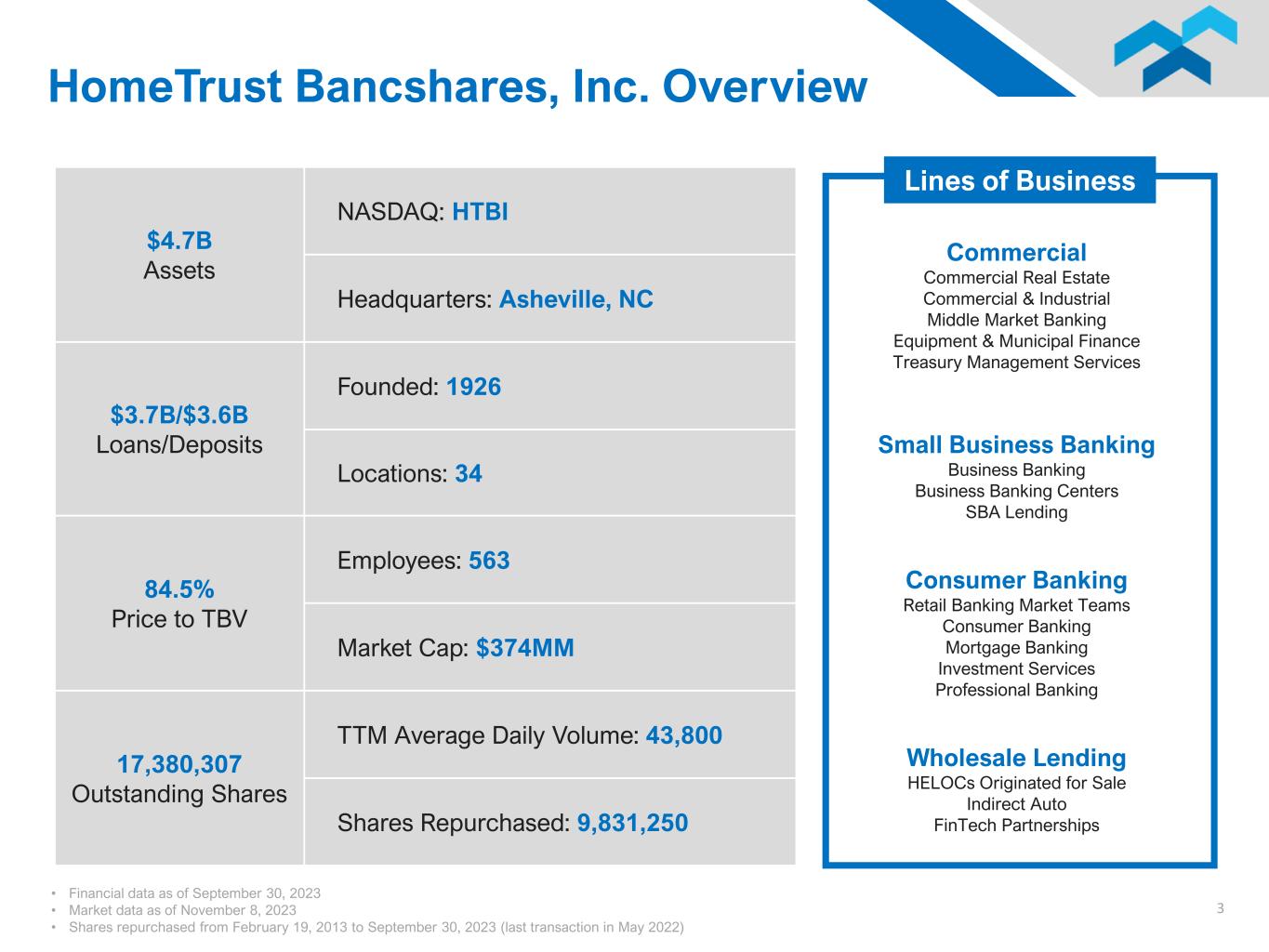 This document includes "forward-looking statements" within the meaning of the Private Securities Litigation Reform Act of 1995. Forward-looking statements are not statements of historical fact, but instead are based on certain assumptions including statements with respect to the Company's beliefs, plans, objectives, goals, expectations, assumptions, and statements about future economic performance and projections of financial items. These forward-looking statements are subject to known and unknown risks, uncertainties and other factors that could cause actual results to differ materially from the results anticipated or implied by forward-looking statements. The factors that could result in material differentiation include, but are not limited to the impact of bank failures or adverse developments of other banks and related negative press about the banking industry in general on investor and depositor sentiment; the remaining effect of the COVID-19 pandemic on general economic and financial market conditions and on public health, both nationally and in the Company's market areas; expected revenues, cost savings, synergies and other benefits from merger and acquisition activities, including the Company's recent merger with Quantum Capital Corp., might not be realized to the extent anticipated, within the anticipated time frames, or at all, and costs or difficulties relating to integration matters, including but not limited to customer and employee retention, might be greater than expected; goodwill impairment charges might be incurred; increased competitive pressures; changes in the interest rate environment; changes in general economic conditions and conditions within the securities markets; legislative and regulatory changes; and the effects of inflation, a potential recession, and other factors described in the Company's latest annual Report on Form 10-K and Quarterly Reports on Form 10-Q and other documents filed with or furnished to the Securities and Exchange Commission - which are available on the Company's website at www.htb.com and on the SEC's website at www.sec.gov. Any of the forward-looking statements that the Company makes in this document or the documents they file with or furnish to the SEC are based upon management's beliefs and assumptions at the time they are made and may turn out to be wrong because of inaccurate assumptions they might make, because of the factors described above or because of other factors that they cannot foresee. The Company does not undertake and specifically disclaim any obligation to revise any forward-looking statements to reflect the occurrence of anticipated or unanticipated events or circumstances after the date of such statements. Forward Looking Statements 2