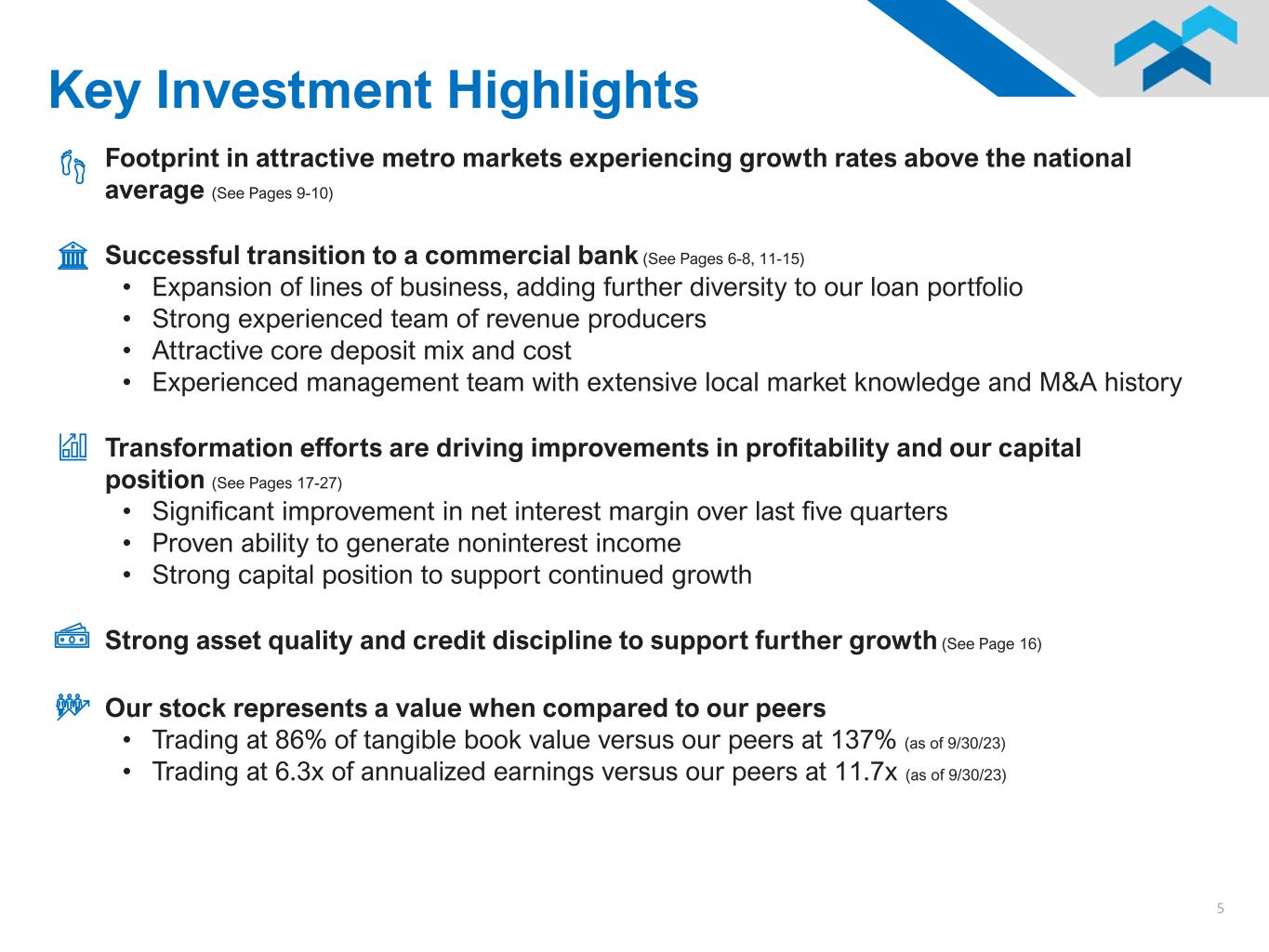 4 Recent Recognition Named one of the 2023 Top 20 “Great Employers to Work for in NC” by the Best Companies Group Voted “Best Small Bank in North Carolina” by Newsweek for three consecutive years (2021 - 2023) NC, VA, TN and GA were the top 4 states on CNBC’s list of America’s Top States for Business 2023