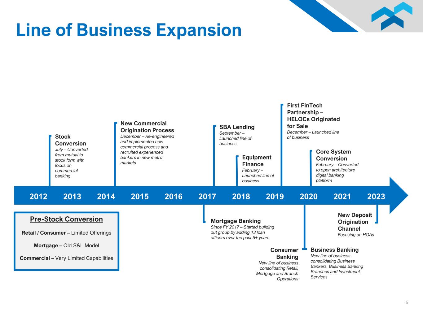 6 Pre-Stock Conversion Retail / Consumer – Limited Offerings Mortgage – Old S&L Model Commercial – Very Limited Capabilities Stock Conversion July – Converted from mutual to stock form with focus on commercial banking Equipment Finance February – Launched line of business SBA Lending September – Launched line of business Mortgage Banking Since FY 2017 – Started building out group by adding 13 loan officers over the past 5+ years New Commercial Origination Process December – Re-engineered and implemented new commercial process and recruited experienced bankers in new metro markets Consumer Banking New line of business consolidating Retail, Mortgage and Branch Operations Business Banking New line of business consolidating Business Bankers, Business Banking Branches and Investment Services Core System Conversion February – Converted to open architecture digital banking platform First FinTech Partnership – HELOCs Originated for Sale December – Launched line of business 2012 2013 2014 2015 2016 2017 2018 2019 2020 2021 2023 Line of Business Expansion New Deposit Origination Channel Focusing on HOAs