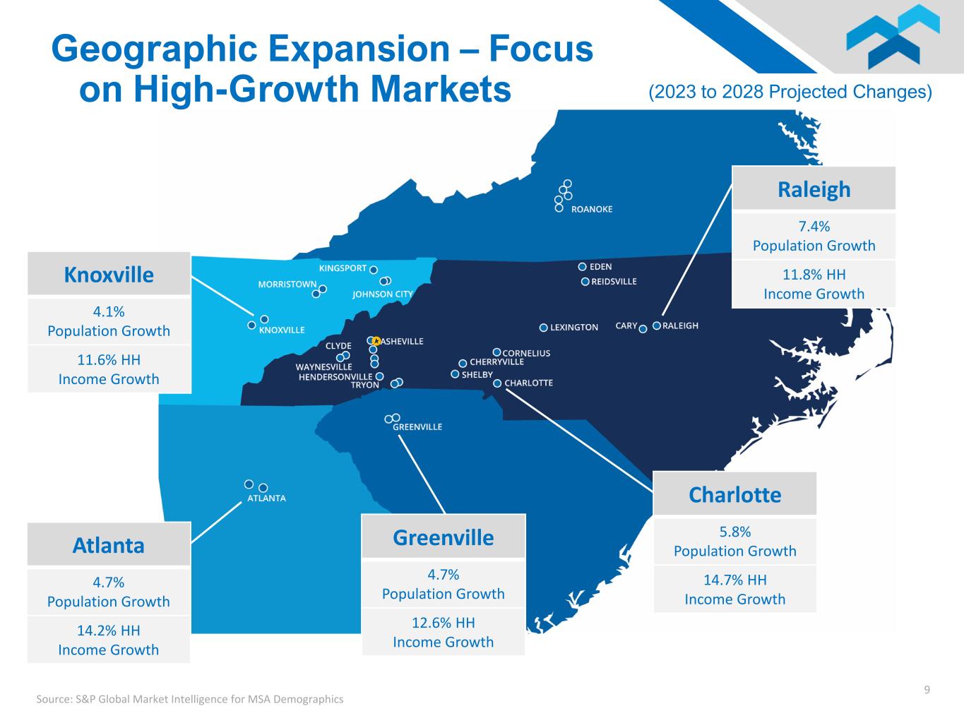 8 Greenville, SC (2013) Tri-Cities and Knoxville, TN (2014) Charlotte, NC (2014) Roanoke, VA (2014) Raleigh, NC (2015) Re-engineered of CML LOB (2014) Introduced Indirect Auto (2014) Re-engineered Mtg LOB (2016) Re-engineered Treasury Mgmt (2016) Introduced SBA and Equipment Finance (2018) Introduced Symmetry (HELOCs) and Business Banking (2019) High Performing Peer Funding Levels Increase Fee Income Deposit Verticals Pilot Deposit BDOs Business Banking Micro Business Lending Engaged Employees Limited FinTech Partnerships Optimizing Processes Automation Maturing Lines of Business Expand Digital Channels Phase 1 Geographic Expansion 2013 - 2015 Phase 2 Line of Business Expansion 2014 - 2020 Phase 3 Deposit Growth 2021 - 2024 Phase 4 Business Transformation 2022 - 2024 Business Transformation: Phases of Progress