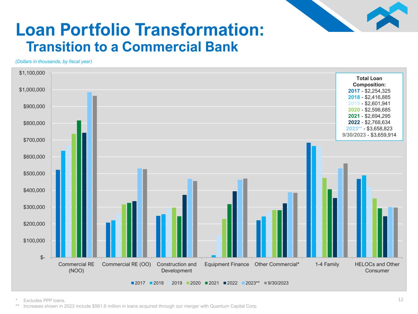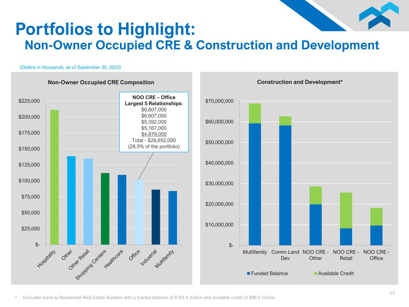 12 $- $100,000 $200,000 $300,000 $400,000 $500,000 $600,000 $700,000 $800,000 $900,000 $1,000,000 $1,100,000 Commercial RE (NOO) Commercial RE (OO) Construction and Development Equipment Finance Other Commercial* 1-4 Family HELOCs and Other Consumer 2017 2018 2019 2020 2021 2022 2023** 9/30/2023 (Dollars in thousands, by fiscal year) Total Loan Composition: 2017 - $2,254,325 2018 - $2,416,885 2019 - $2,601,941 2020 - $2,598,685 2021 - $2,694,295 2022 - $2,768,634 2023** - $3,658,823 9/30/2023 - $3,659,914 Loan Portfolio Transformation: Transition to a Commercial Bank * Excludes PPP loans. ** Increases shown in 2023 include $561.9 million in loans acquired through our merger with Quantum Capital Corp.