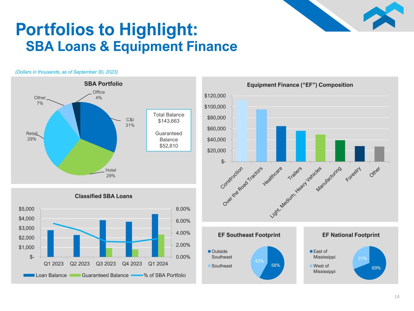13 (Dollars in thousands, as of September 30, 2023) Portfolios to Highlight: Non-Owner Occupied CRE & Construction and Development $- $25,000 $50,000 $75,000 $100,000 $125,000 $150,000 $175,000 $200,000 $225,000 Non-Owner Occupied CRE Composition NOO CRE – Office Largest 5 Relationships: $6,607,000 $6,607,000 $5,392,000 $5,167,000 $4,879,000 Total - $28,652,000 (28.5% of the portfolio) $- $10,000,000 $20,000,000 $30,000,000 $40,000,000 $50,000,000 $60,000,000 $70,000,000 Multifamily Comm Land Dev NOO CRE - Other NOO CRE - Retail NOO CRE - Office Construction and Development* Funded Balance Available Credit * Excludes loans to Residential Real Estate Builders with a funded balance of $164.4 million and available credit of $86.5 million.