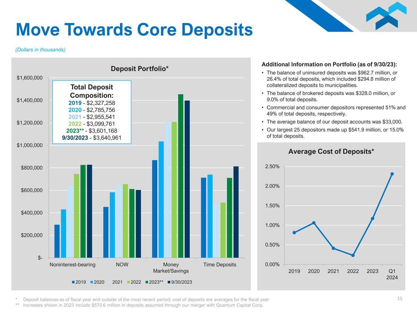 14 Portfolios to Highlight: SBA Loans & Equipment Finance C&I 31% Hotel 29% Retail 29% Other 7% Office 4% SBA Portfolio Total Balance $143,663 Guaranteed Balance $52,810 (Dollars in thousands, as of September 30, 2023) $- $20,000 $40,000 $60,000 $80,000 $100,000 $120,000 Equipment Finance (“EF”) Composition 58% 42% EF Southeast Footprint Outside Southeast Southeast 69% 31% EF National Footprint East of Mississippi West of Mississippi 0.00% 2.00% 4.00% 6.00% 8.00% $- $1,000 $2,000 $3,000 $4,000 $5,000 Q1 2023 Q2 2023 Q3 2023 Q4 2023 Q1 2024 Classified SBA Loans Loan Balance Guaranteed Balance % of SBA Portfolio