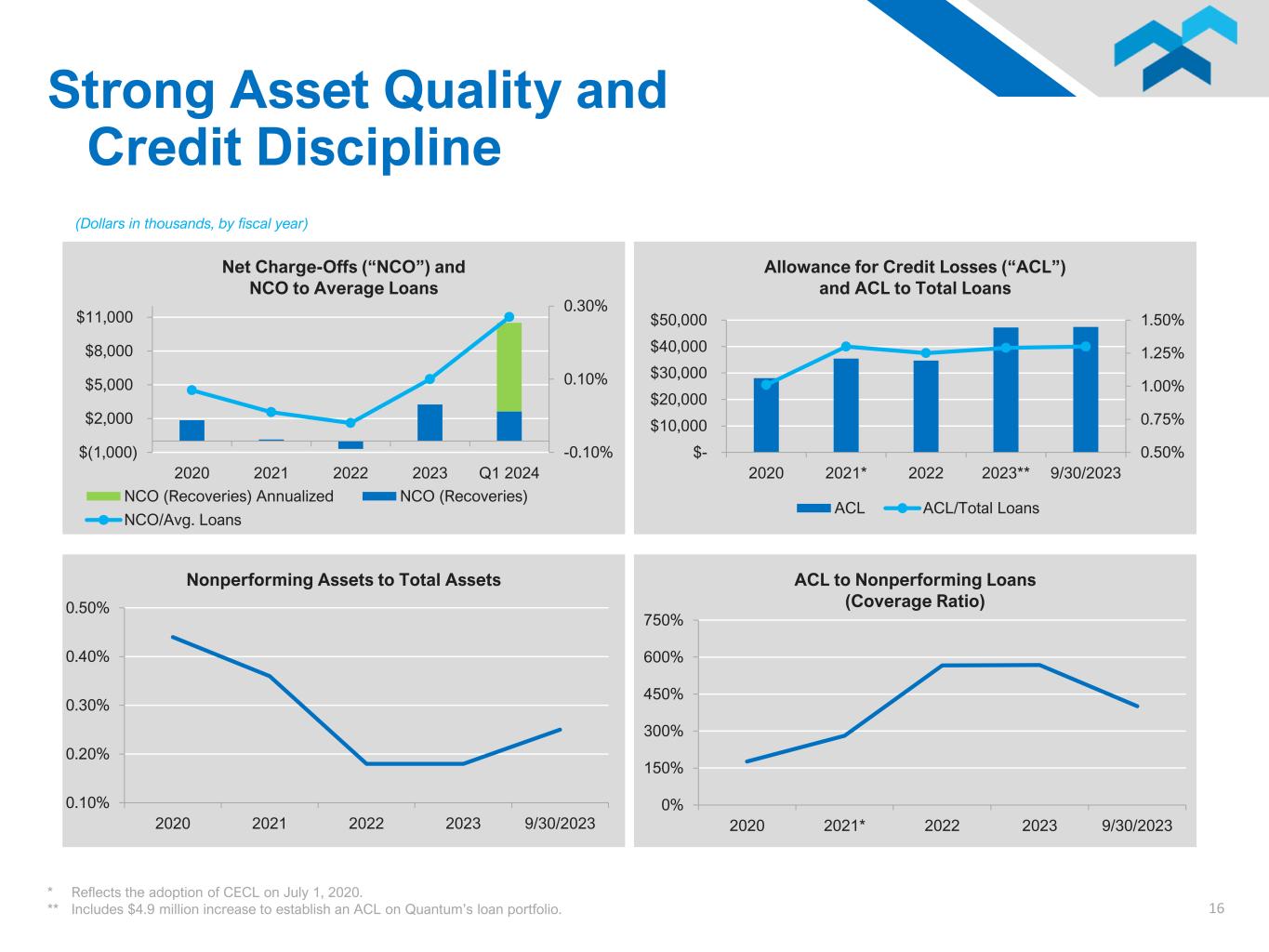 15 0.00% 0.50% 1.00% 1.50% 2.00% 2.50% 2019 2020 2021 2022 2023 Q1 2024 Average Cost of Deposits* $- $200,000 $400,000 $600,000 $800,000 $1,000,000 $1,200,000 $1,400,000 $1,600,000 Noninterest-bearing NOW Money Market/Savings Time Deposits Deposit Portfolio* 2019 2020 2021 2022 2023** 9/30/2023 (Dollars in thousands) Total Deposit Composition: 2019 - $2,327,258 2020 - $2,785,756 2021 - $2,955,541 2022 - $3,099,761 2023** - $3,601,168 9/30/2023 - $3,640,961 Move Towards Core Deposits * Deposit balances as of fiscal year end outside of the most recent period; cost of deposits are averages for the fiscal year ** Increases shown in 2023 include $570.6 million in deposits assumed through our merger with Quantum Capital Corp. Additional Information on Portfolio (as of 9/30/23): • The balance of uninsured deposits was $962.7 million, or 26.4% of total deposits, which included $294.8 million of collateralized deposits to municipalities. • The balance of brokered deposits was $328.0 million, or 9.0% of total deposits. • Commercial and consumer depositors represented 51% and 49% of total deposits, respectively. • The average balance of our deposit accounts was $33,000. • Our largest 25 depositors made up $541.9 million, or 15.0% of total deposits.