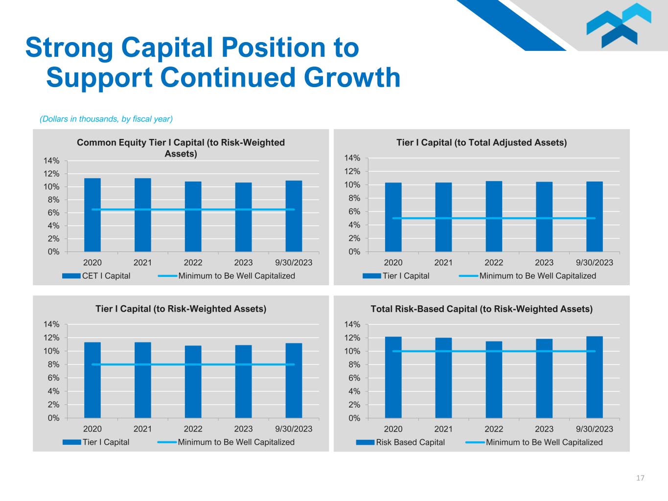 * Reflects the adoption of CECL on July 1, 2020. ** Includes $4.9 million increase to establish an ACL on Quantum’s loan portfolio. 16 -0.10% 0.10% 0.30% $(1,000) $2,000 $5,000 $8,000 $11,000 2020 2021 2022 2023 Q1 2024 Net Charge-Offs (“NCO”) and NCO to Average Loans NCO (Recoveries) Annualized NCO (Recoveries) NCO/Avg. Loans 0.50% 0.75% 1.00% 1.25% 1.50% $- $10,000 $20,000 $30,000 $40,000 $50,000 2020 2021* 2022 2023** 9/30/2023 Allowance for Credit Losses (“ACL”) and ACL to Total Loans ACL ACL/Total Loans 0.10% 0.20% 0.30% 0.40% 0.50% 2020 2021 2022 2023 9/30/2023 Nonperforming Assets to Total Assets 0% 150% 300% 450% 600% 750% 2020 2021* 2022 2023 9/30/2023 ACL to Nonperforming Loans (Coverage Ratio) (Dollars in thousands, by fiscal year) Strong Asset Quality and Credit Discipline