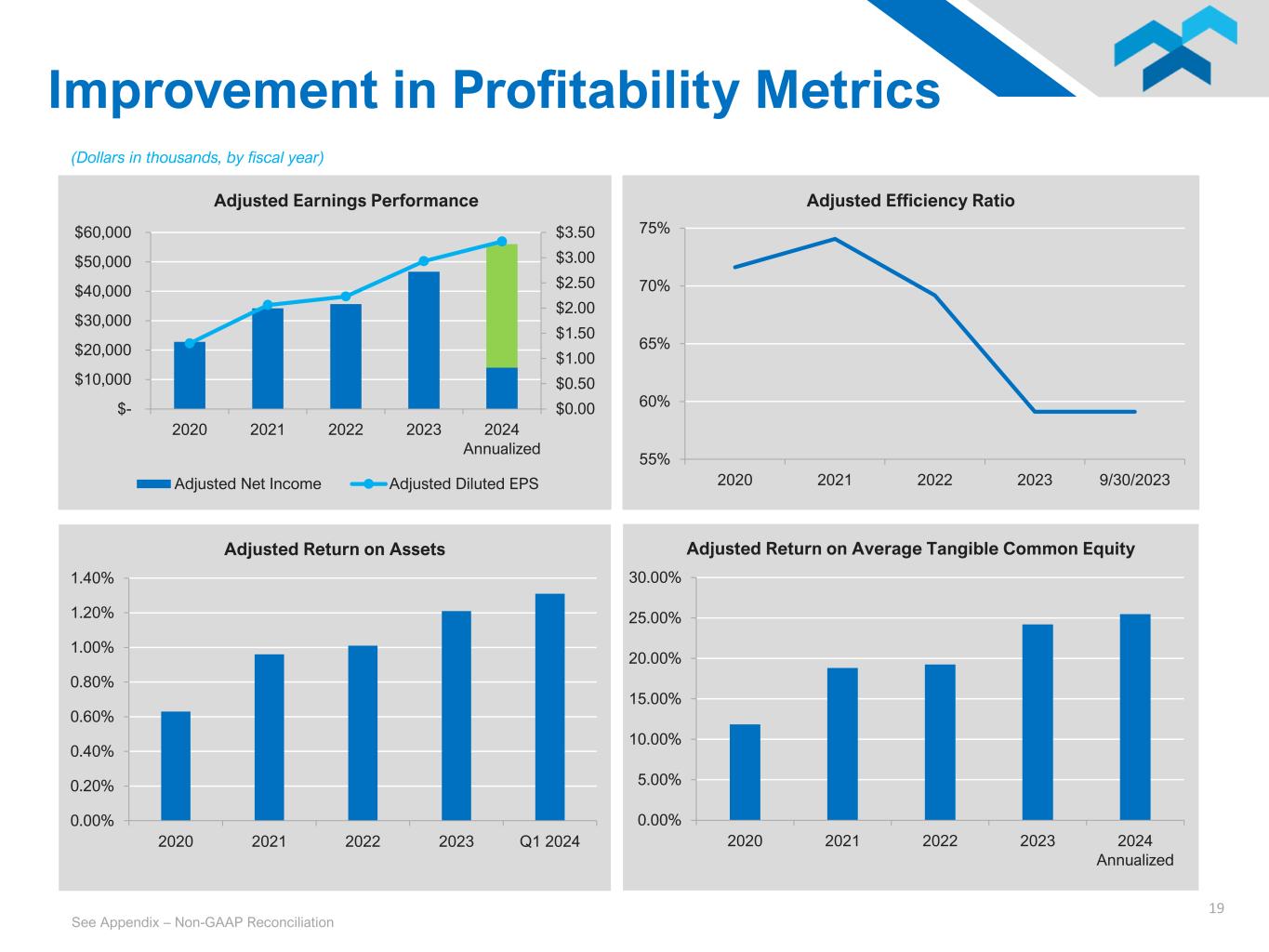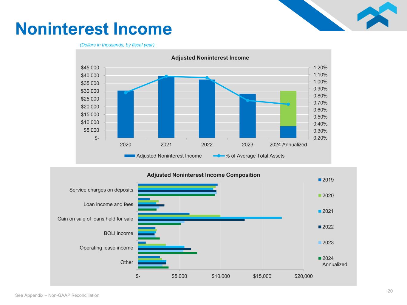 19 $0.00 $0.50 $1.00 $1.50 $2.00 $2.50 $3.00 $3.50 $- $10,000 $20,000 $30,000 $40,000 $50,000 $60,000 2020 2021 2022 2023 2024 Annualized Adjusted Earnings Performance Adjusted Net Income Adjusted Diluted EPS 0.00% 0.20% 0.40% 0.60% 0.80% 1.00% 1.20% 1.40% 2020 2021 2022 2023 Q1 2024 Adjusted Return on Assets (Dollars in thousands, by fiscal year) 55% 60% 65% 70% 75% 2020 2021 2022 2023 9/30/2023 Adjusted Efficiency Ratio Improvement in Profitability Metrics See Appendix – Non-GAAP Reconciliation 0.00% 5.00% 10.00% 15.00% 20.00% 25.00% 30.00% 2020 2021 2022 2023 2024 Annualized Adjusted Return on Average Tangible Common Equity
