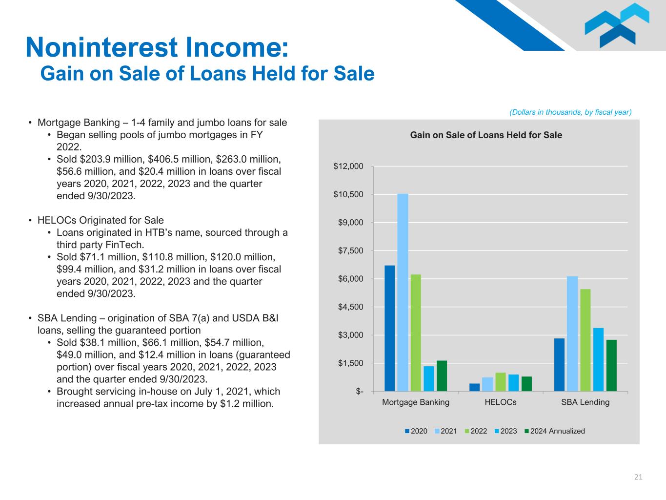 20 0.20% 0.30% 0.40% 0.50% 0.60% 0.70% 0.80% 0.90% 1.00% 1.10% 1.20% $- $5,000 $10,000 $15,000 $20,000 $25,000 $30,000 $35,000 $40,000 $45,000 2020 2021 2022 2023 2024 Annualized Adjusted Noninterest Income Adjusted Noninterest Income % of Average Total Assets Service charges on deposits Loan income and fees Gain on sale of loans held for sale BOLI income Operating lease income Other $- $5,000 $10,000 $15,000 $20,000 Adjusted Noninterest Income Composition 2019 2020 2021 2022 2023 2024 Annualized (Dollars in thousands, by fiscal year) Noninterest Income See Appendix – Non-GAAP Reconciliation