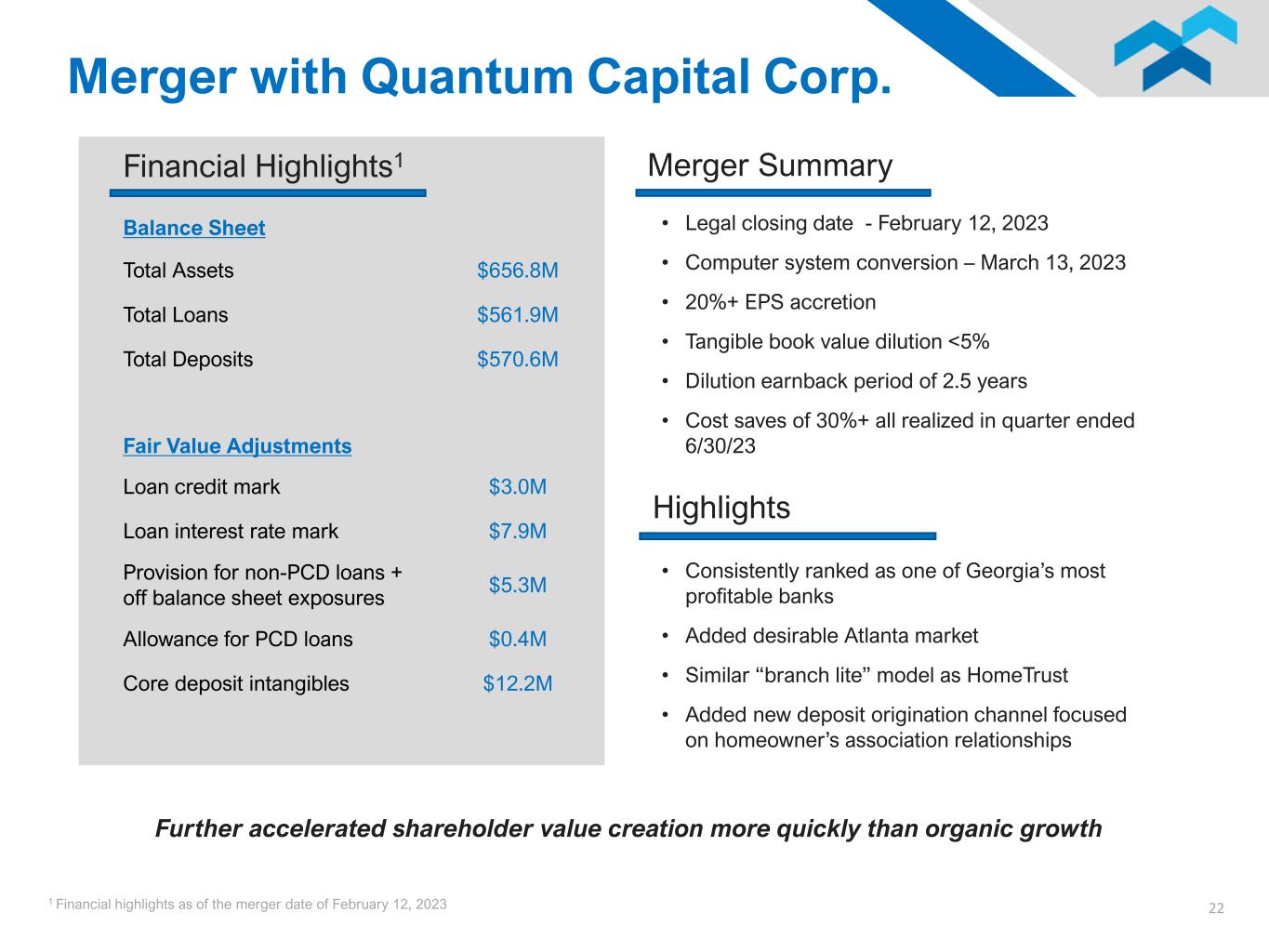 1 Financial highlights as of the merger date of February 12, 2023 22 Highlights Financial Highlights1 Balance Sheet Loan credit mark $3.0M Loan interest rate mark $7.9M Provision for non-PCD loans + off balance sheet exposures $5.3M Allowance for PCD loans $0.4M Core deposit intangibles $12.2M Fair Value Adjustments Merger Summary Merger with Quantum Capital Corp. • Legal closing date - February 12, 2023 • Computer system conversion – March 13, 2023 • 20%+ EPS accretion • Tangible book value dilution <5% • Dilution earnback period of 2.5 years • Cost saves of 30%+ all realized in quarter ended 6/30/23 • Consistently ranked as one of Georgia’s most profitable banks • Added desirable Atlanta market • Similar “branch lite” model as HomeTrust • Added new deposit origination channel focused on homeowner’s association relationships Further accelerated shareholder value creation more quickly than organic growth Total Assets $656.8M Total Loans $561.9M Total Deposits $570.6M
