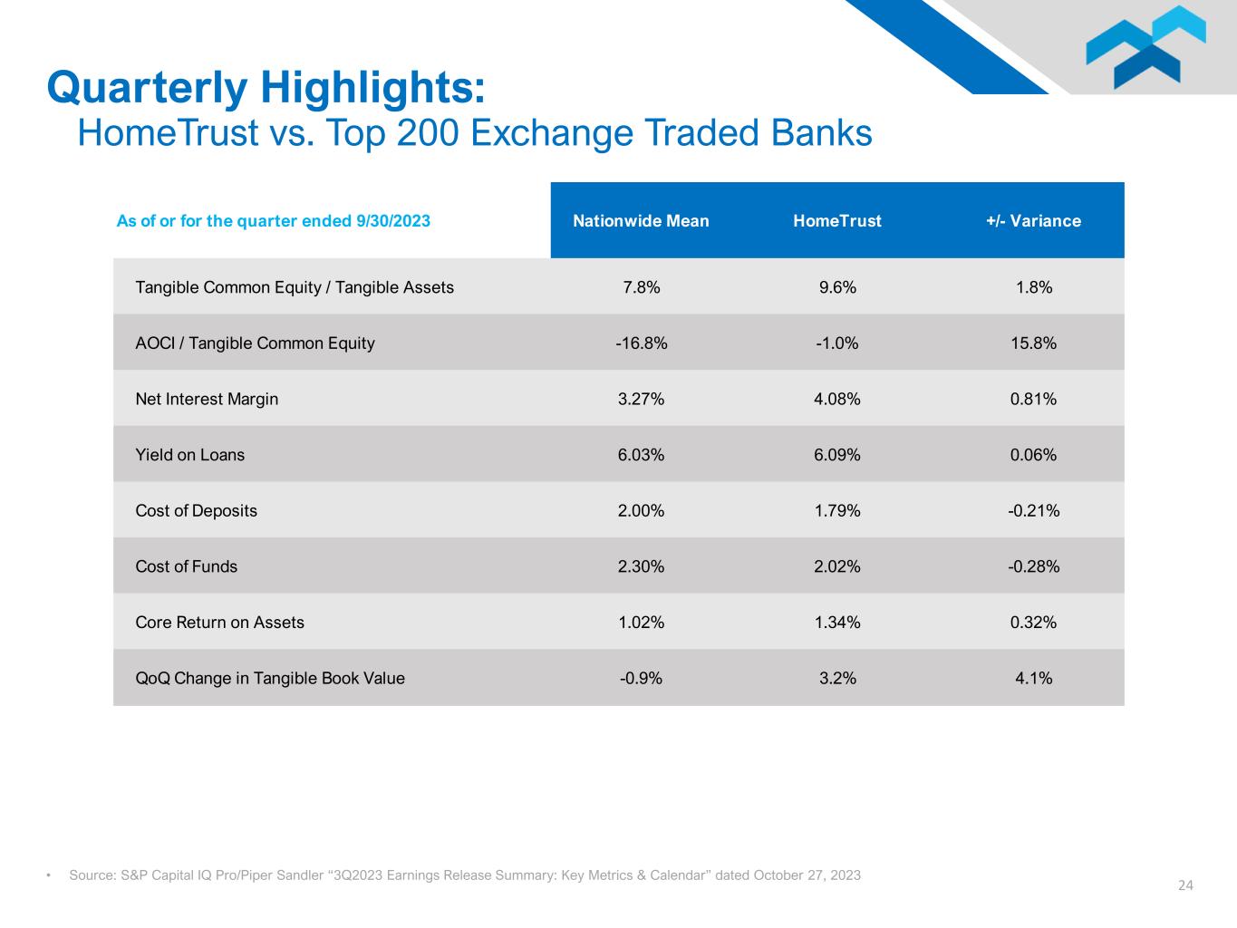24 Quarterly Highlights: HomeTrust vs. Top 200 Exchange Traded Banks • Source: S&P Capital IQ Pro/Piper Sandler “3Q2023 Earnings Release Summary: Key Metrics & Calendar” dated October 27, 2023 As of or for the quarter ended 9/30/2023 Nationwide Mean HomeTrust +/- Variance Tangible Common Equity / Tangible Assets 7.8% 9.6% 1.8% AOCI / Tangible Common Equity -16.8% -1.0% 15.8% Net Interest Margin 3.27% 4.08% 0.81% Yield on Loans 6.03% 6.09% 0.06% Cost of Deposits 2.00% 1.79% -0.21% Cost of Funds 2.30% 2.02% -0.28% Core Return on Assets 1.02% 1.34% 0.32% QoQ Change in Tangible Book Value -0.9% 3.2% 4.1%