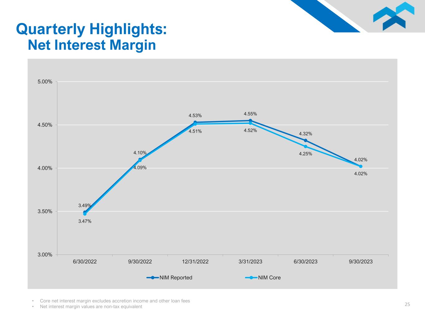 23 Earnings (GAAP) 9/30/2023 6/30/2023 3/31/2023 12/31/2022 9/30/2022 Net income 14,833$ 15,013$ 6,734$ 13,658$ 9,199$ Earnings per share (EPS) - diluted 0.88$ 0.90$ 0.40$ 0.90$ 0.60$ Return on assets (ROA) 1.33% 1.39% 0.69% 1.54% 1.02% Return on equity (ROE) 12.23% 12.85% 6.21% 13.37% 9.25% Net interest margin 4.02% 4.32% 4.55% 4.53% 4.10% Loan Growth Net loan growth: $ Growth 1,091$ 9,844$ 101,423$ 117,840$ 98,488$ % Growth (annualized) 0.12% 1.08% 13.59% 16.44% 14.23% Loan originations: Commercial portfolio 224,443$ 196,539$ 173,385$ 183,340$ 169,272$ Retail portfolio 65,691 68,678 105,915 127,134 121,673 Loans originated for sale 155,846 142,024 105,794 66,582 67,112 Total originations 445,980$ 407,241$ 385,094$ 377,056$ 358,057$ Asset Quality Total assets 4,651,997$ 4,607,487$ 4,526,870$ 3,647,015$ 3,555,186$ Nonperforming assets to total assets 0.25% 0.18% 0.18% 0.17% 0.20% Classified assets to total assets 0.76% 0.53% 0.49% 0.50% 0.54% Quarterly Highlights