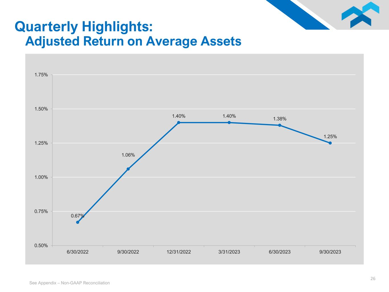 25 3.49% 4.10% 4.53% 4.55% 4.32% 4.02% 3.47% 4.09% 4.51% 4.52% 4.25% 4.02% 3.00% 3.50% 4.00% 4.50% 5.00% 6/30/2022 9/30/2022 12/31/2022 3/31/2023 6/30/2023 9/30/2023 NIM Reported NIM Core • Core net interest margin excludes accretion income and other loan fees • Net interest margin values are non-tax equivalent Quarterly Highlights: Net Interest Margin