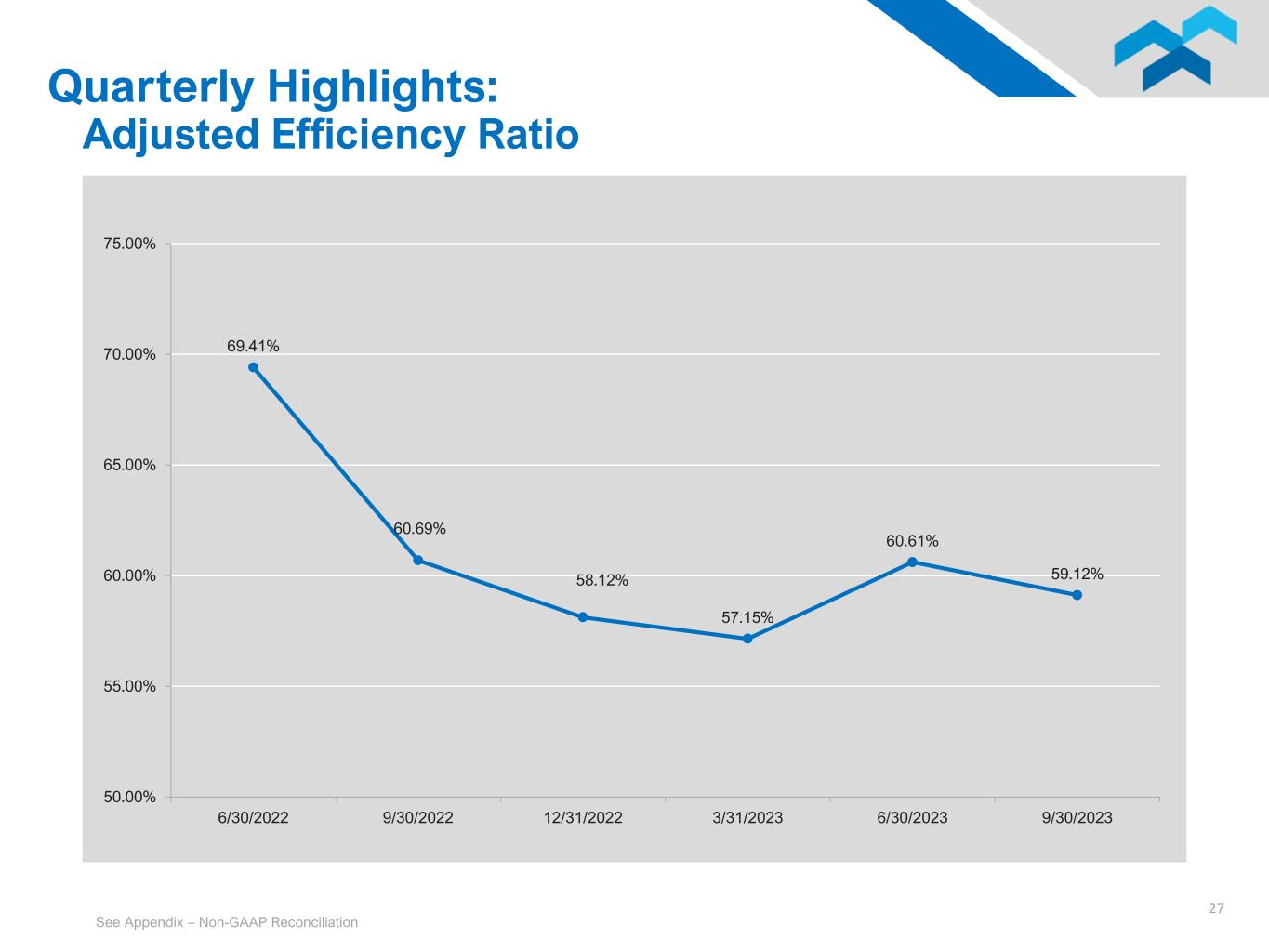 26 0.67% 1.06% 1.40% 1.40% 1.38% 1.25% 0.50% 0.75% 1.00% 1.25% 1.50% 1.75% 6/30/2022 9/30/2022 12/31/2022 3/31/2023 6/30/2023 9/30/2023 Quarterly Highlights: Adjusted Return on Average Assets See Appendix – Non-GAAP Reconciliation