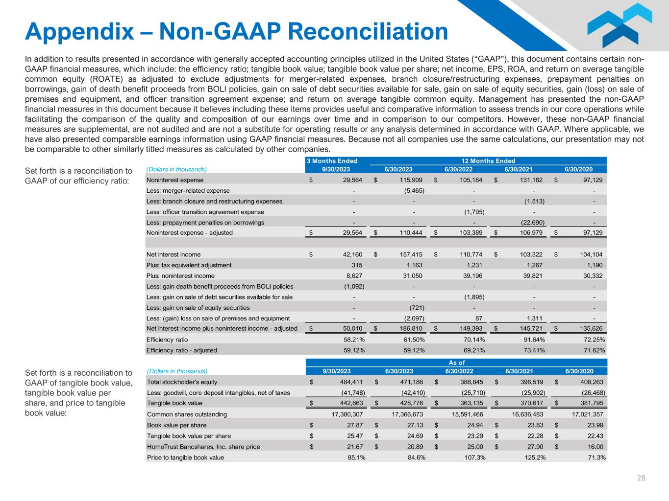 28 Set forth is a reconciliation to GAAP of our efficiency ratio: Set forth is a reconciliation to GAAP of tangible book value, tangible book value per share, and price to tangible book value: 3 Months Ended (Dollars in thousands) 9/30/2023 6/30/2023 6/30/2022 6/30/2021 6/30/2020 Noninterest expense 29,564$ 115,909$ 105,184$ 131,182$ 97,129$ Less: merger-related expense - (5,465) - - - Less: branch closure and restructuring expenses - - - (1,513) - Less: officer transition agreement expense - - (1,795) - - Less: prepayment penalties on borrowings - - - (22,690) - Noninterest expense - adjusted 29,564$ 110,444$ 103,389$ 106,979$ 97,129$ Net interest income 42,160$ 157,415$ 110,774$ 103,322$ 104,104$ Plus: tax equivalent adjustment 315 1,163 1,231 1,267 1,190 Plus: noninterest income 8,627 31,050 39,196 39,821 30,332 Less: gain death benefit proceeds from BOLI policies (1,092) - - - - Less: gain on sale of debt securities available for sale - - (1,895) - - Less: gain on sale of equity securities - (721) - - - Less: (gain) loss on sale of premises and equipment - (2,097) 87 1,311 - Net interest income plus noninterest income - adjusted 50,010$ 186,810$ 149,393$ 145,721$ 135,626$ Efficiency ratio 58.21% 61.50% 70.14% 91.64% 72.25% Efficiency ratio - adjusted 59.12% 59.12% 69.21% 73.41% 71.62% 12 Months Ended (Dollars in thousands) 9/30/2023 6/30/2023 6/30/2022 6/30/2021 6/30/2020 Total stockholder's equity 484,411$ 471,186$ 388,845$ 396,519$ 408,263$ Less: goodwill, core deposit intangibles, net of taxes (41,748) (42,410) (25,710) (25,902) (26,468) Tangible book value 442,663$ 428,776$ 363,135$ 370,617$ 381,795$ Common shares outstanding 17,380,307 17,366,673 15,591,466 16,636,483 17,021,357 Book value per share 27.87$ 27.13$ 24.94$ 23.83$ 23.99$ Tangible book value per share 25.47$ 24.69$ 23.29$ 22.28$ 22.43$ HomeTrust Bancshares, Inc. share price 21.67$ 20.89$ 25.00$ 27.90$ 16.00$ Price to tangible book value 85.1% 84.6% 107.3% 125.2% 71.3% As of Appendix – Non-GAAP Reconciliation In addition to results presented in accordance with generally accepted accounting principles utilized in the United States (“GAAP”), this document contains certain non- GAAP financial measures, which include: the efficiency ratio; tangible book value; tangible book value per share; net income, EPS, ROA, and return on average tangible common equity (ROATE) as adjusted to exclude adjustments for merger-related expenses, branch closure/restructuring expenses, prepayment penalties on borrowings, gain of death benefit proceeds from BOLI policies, gain on sale of debt securities available for sale, gain on sale of equity securities, gain (loss) on sale of premises and equipment, and officer transition agreement expense; and return on average tangible common equity. Management has presented the non-GAAP financial measures in this document because it believes including these items provides useful and comparative information to assess trends in our core operations while facilitating the comparison of the quality and composition of our earnings over time and in comparison to our competitors. However, these non-GAAP financial measures are supplemental, are not audited and are not a substitute for operating results or any analysis determined in accordance with GAAP. Where applicable, we have also presented comparable earnings information using GAAP financial measures. Because not all companies use the same calculations, our presentation may not be comparable to other similarly titled measures as calculated by other companies.
