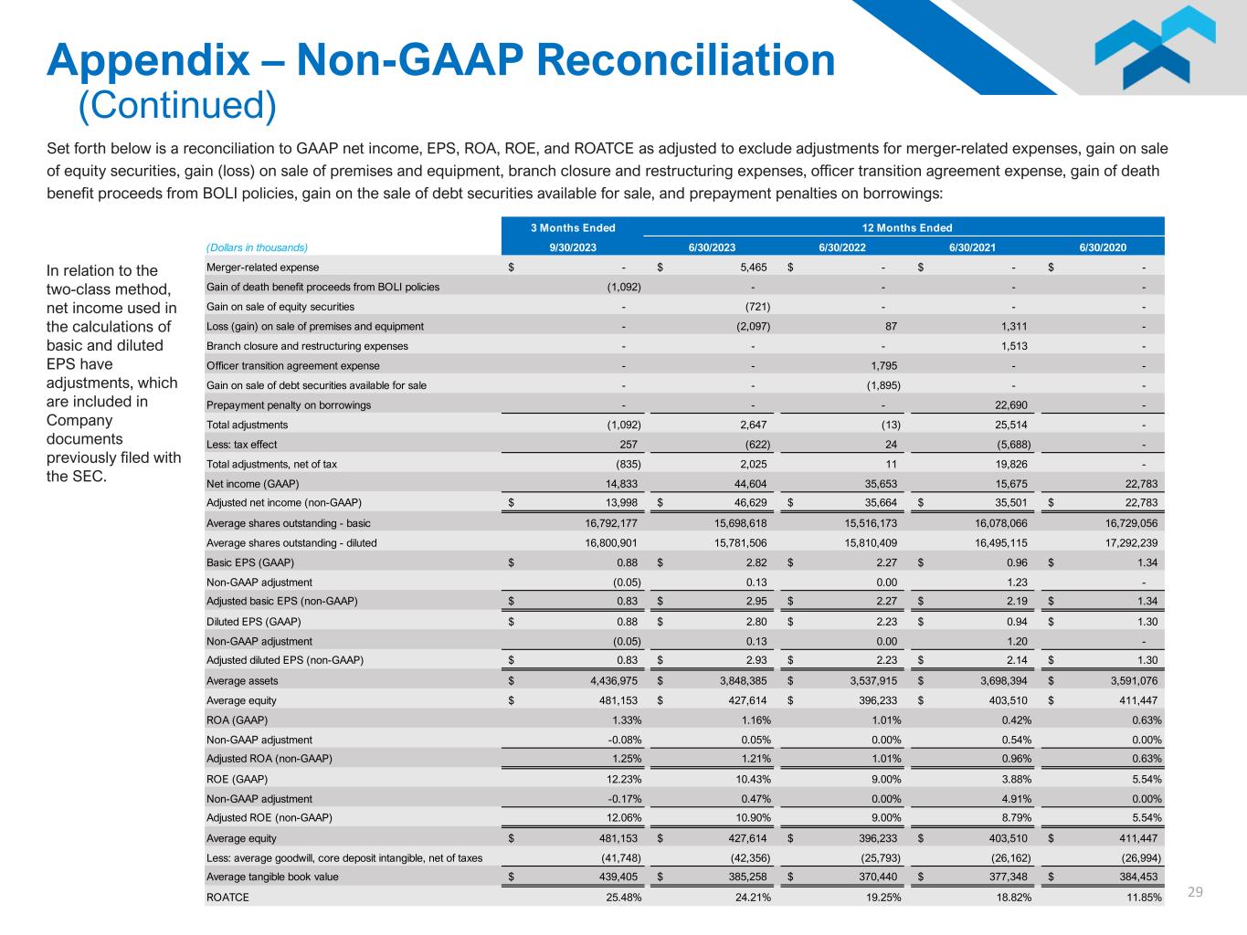 29 Set forth below is a reconciliation to GAAP net income, EPS, ROA, ROE, and ROATCE as adjusted to exclude adjustments for merger-related expenses, gain on sale of equity securities, gain (loss) on sale of premises and equipment, branch closure and restructuring expenses, officer transition agreement expense, gain of death benefit proceeds from BOLI policies, gain on the sale of debt securities available for sale, and prepayment penalties on borrowings: In relation to the two-class method, net income used in the calculations of basic and diluted EPS have adjustments, which are included in Company documents previously filed with the SEC. Appendix – Non-GAAP Reconciliation (Continued) 3 Months Ended (Dollars in thousands) 9/30/2023 6/30/2023 6/30/2022 6/30/2021 6/30/2020 Merger-related expense -$ 5,465$ -$ -$ -$ Gain of death benefit proceeds from BOLI policies (1,092) - - - - Gain on sale of equity securities - (721) - - - Loss (gain) on sale of premises and equipment - (2,097) 87 1,311 - Branch closure and restructuring expenses - - - 1,513 - Officer transition agreement expense - - 1,795 - - Gain on sale of debt securities available for sale - - (1,895) - - Prepayment penalty on borrowings - - - 22,690 - Total adjustments (1,092) 2,647 (13) 25,514 - Less: tax effect 257 (622) 24 (5,688) - Total adjustments, net of tax (835) 2,025 11 19,826 - Net income (GAAP) 14,833 44,604 35,653 15,675 22,783 Adjusted net income (non-GAAP) 13,998$ 46,629$ 35,664$ 35,501$ 22,783$ Average shares outstanding - basic 16,792,177 15,698,618 15,516,173 16,078,066 16,729,056 Average shares outstanding - diluted 16,800,901 15,781,506 15,810,409 16,495,115 17,292,239 Basic EPS (GAAP) 0.88$ 2.82$ 2.27$ 0.96$ 1.34$ Non-GAAP adjustment (0.05) 0.13 0.00 1.23 - Adjusted basic EPS (non-GAAP) 0.83$ 2.95$ 2.27$ 2.19$ 1.34$ Diluted EPS (GAAP) 0.88$ 2.80$ 2.23$ 0.94$ 1.30$ Non-GAAP adjustment (0.05) 0.13 0.00 1.20 - Adjusted diluted EPS (non-GAAP) 0.83$ 2.93$ 2.23$ 2.14$ 1.30$ Average assets 4,436,975$ 3,848,385$ 3,537,915$ 3,698,394$ 3,591,076$ Average equity 481,153$ 427,614$ 396,233$ 403,510$ 411,447$ ROA (GAAP) 1.33% 1.16% 1.01% 0.42% 0.63% Non-GAAP adjustment -0.08% 0.05% 0.00% 0.54% 0.00% Adjusted ROA (non-GAAP) 1.25% 1.21% 1.01% 0.96% 0.63% ROE (GAAP) 12.23% 10.43% 9.00% 3.88% 5.54% Non-GAAP adjustment -0.17% 0.47% 0.00% 4.91% 0.00% Adjusted ROE (non-GAAP) 12.06% 10.90% 9.00% 8.79% 5.54% Average equity 481,153$ 427,614$ 396,233$ 403,510$ 411,447$ Less: average goodwill, core deposit intangible, net of taxes (41,748) (42,356) (25,793) (26,162) (26,994) Average tangible book value 439,405$ 385,258$ 370,440$ 377,348$ 384,453$ ROATCE 25.48% 24.21% 19.25% 18.82% 11.85% 12 Months Ended