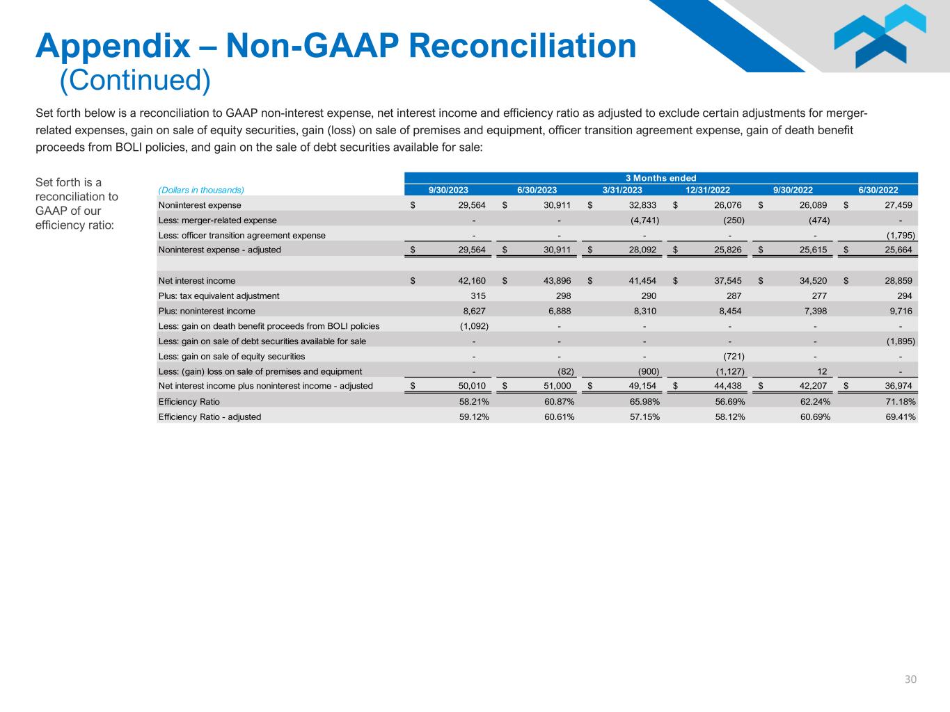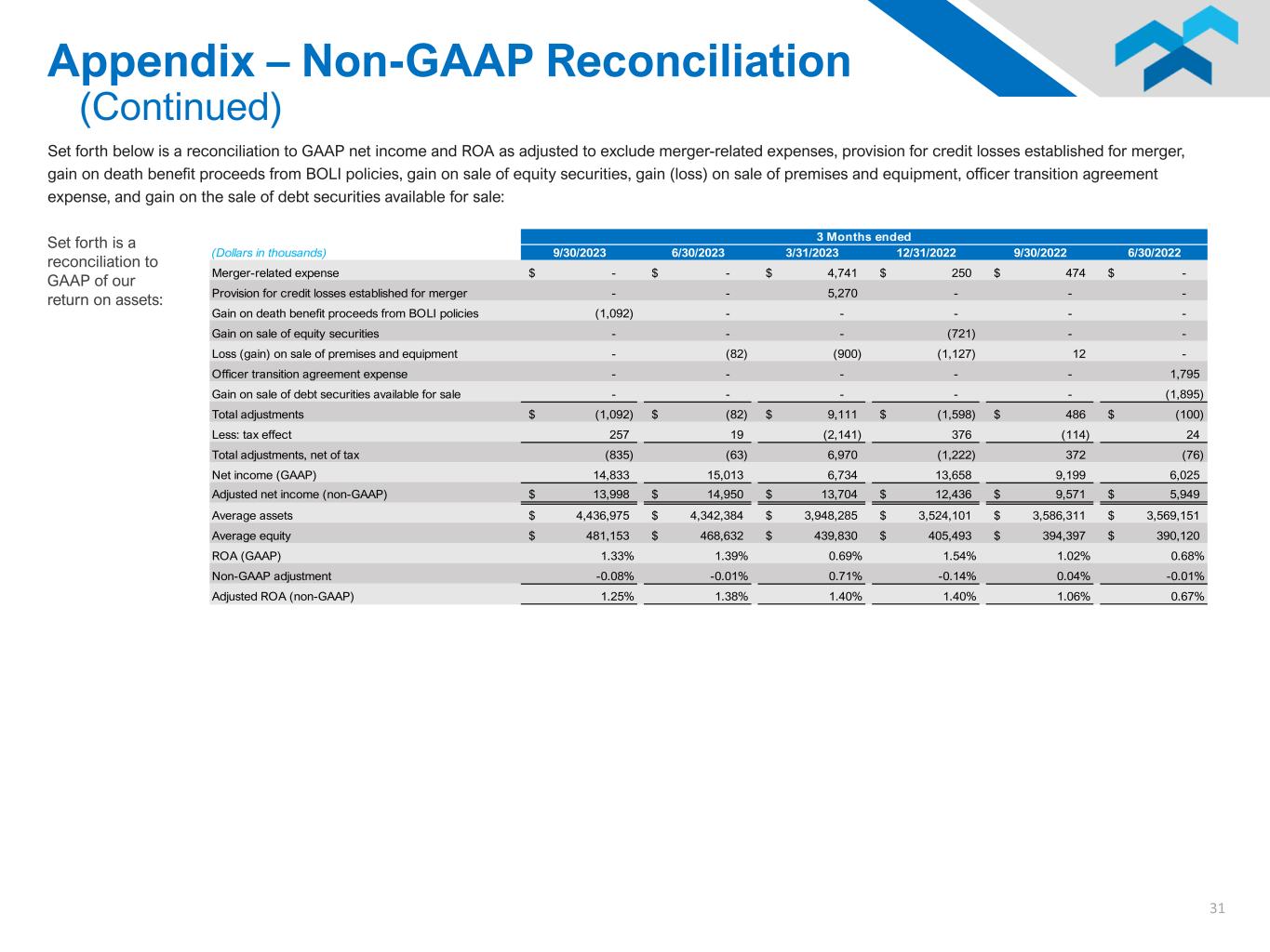 30 Set forth below is a reconciliation to GAAP non-interest expense, net interest income and efficiency ratio as adjusted to exclude certain adjustments for merger- related expenses, gain on sale of equity securities, gain (loss) on sale of premises and equipment, officer transition agreement expense, gain of death benefit proceeds from BOLI policies, and gain on the sale of debt securities available for sale: Appendix – Non-GAAP Reconciliation (Continued) Set forth is a reconciliation to GAAP of our efficiency ratio: (Dollars in thousands) 9/30/2023 6/30/2023 3/31/2023 12/31/2022 9/30/2022 6/30/2022 Noniinterest expense 29,564$ 30,911$ 32,833$ 26,076$ 26,089$ 27,459$ Less: merger-related expense - - (4,741) (250) (474) - Less: officer transition agreement expense - - - - - (1,795) Noninterest expense - adjusted 29,564$ 30,911$ 28,092$ 25,826$ 25,615$ 25,664$ Net interest income 42,160$ 43,896$ 41,454$ 37,545$ 34,520$ 28,859$ Plus: tax equivalent adjustment 315 298 290 287 277 294 Plus: noninterest income 8,627 6,888 8,310 8,454 7,398 9,716 Less: gain on death benefit proceeds from BOLI policies (1,092) - - - - - Less: gain on sale of debt securities available for sale - - - - - (1,895) Less: gain on sale of equity securities - - - (721) - - Less: (gain) loss on sale of premises and equipment - (82) (900) (1,127) 12 - Net interest income plus noninterest income - adjusted 50,010$ 51,000$ 49,154$ 44,438$ 42,207$ 36,974$ Efficiency Ratio 58.21% 60.87% 65.98% 56.69% 62.24% 71.18% Efficiency Ratio - adjusted 59.12% 60.61% 57.15% 58.12% 60.69% 69.41% 3 Months ended