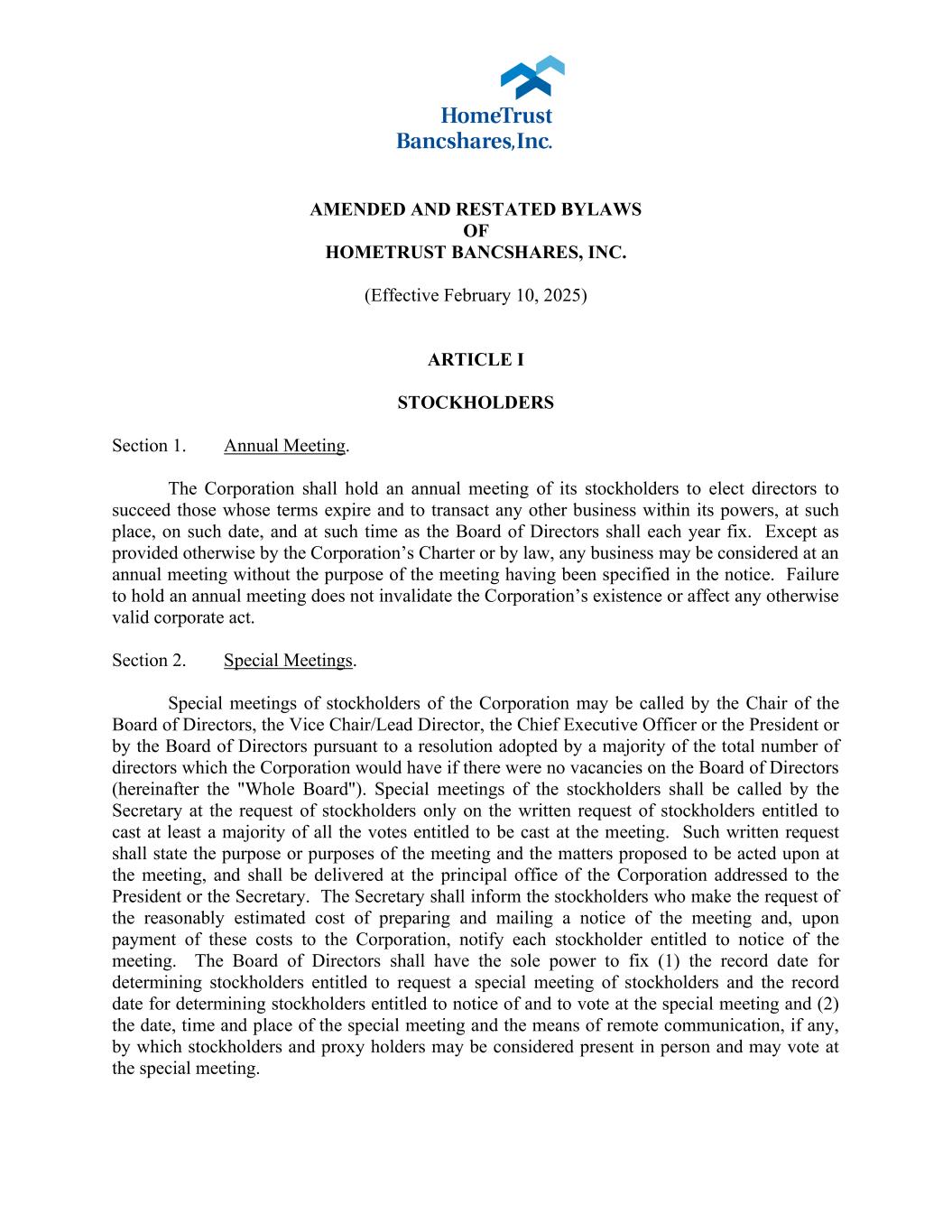 AMENDED AND RESTATED BYLAWS OF HOMETRUST BANCSHARES, INC. (Effective February 10, 2025) ARTICLE I STOCKHOLDERS Section 1. Annual Meeting. The Corporation shall hold an annual meeting of its stockholders to elect directors to succeed those whose terms expire and to transact any other business within its powers, at such place, on such date, and at such time as the Board of Directors shall each year fix. Except as provided otherwise by the Corporation’s Charter or by law, any business may be considered at an annual meeting without the purpose of the meeting having been specified in the notice. Failure to hold an annual meeting does not invalidate the Corporation’s existence or affect any otherwise valid corporate act. Section 2. Special Meetings. Special meetings of stockholders of the Corporation may be called by the Chair of the Board of Directors, the Vice Chair/Lead Director, the Chief Executive Officer or the President or by the Board of Directors pursuant to a resolution adopted by a majority of the total number of directors which the Corporation would have if there were no vacancies on the Board of Directors (hereinafter the "Whole Board"). Special meetings of the stockholders shall be called by the Secretary at the request of stockholders only on the written request of stockholders entitled to cast at least a majority of all the votes entitled to be cast at the meeting. Such written request shall state the purpose or purposes of the meeting and the matters proposed to be acted upon at the meeting, and shall be delivered at the principal office of the Corporation addressed to the President or the Secretary. The Secretary shall inform the stockholders who make the request of the reasonably estimated cost of preparing and mailing a notice of the meeting and, upon payment of these costs to the Corporation, notify each stockholder entitled to notice of the meeting. The Board of Directors shall have the sole power to fix (1) the record date for determining stockholders entitled to request a special meeting of stockholders and the record date for determining stockholders entitled to notice of and to vote at the special meeting and (2) the date, time and place of the special meeting and the means of remote communication, if any, by which stockholders and proxy holders may be considered present in person and may vote at the special meeting.